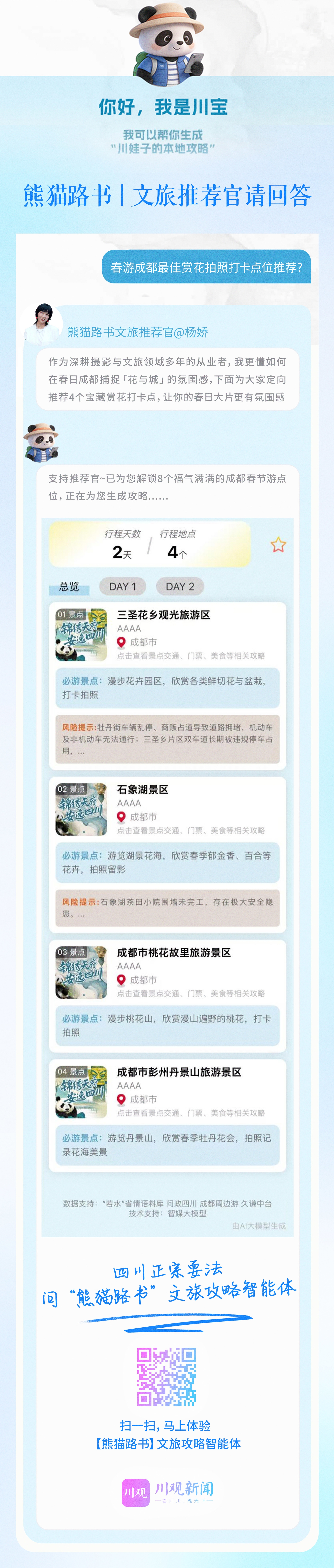 本周四川全域进入春季赏花+文体赛事+文博新地标三重热点叠加期,漫花庄园、都江堰樱花、江口沉银博物馆刷屏,三八妇女节景区惠民政策集中落地,“赏花+文博+民俗+赛事”成为本周四川文旅核心关键词。