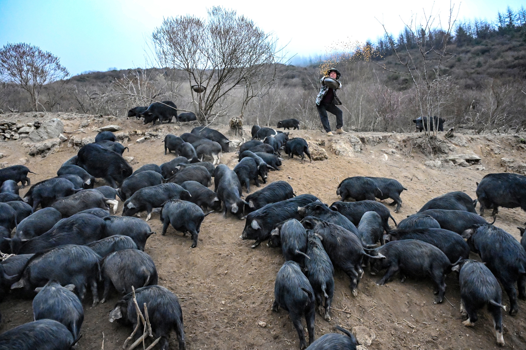 2026年3月13日,在四川省阿坝州汶川县灞州镇周达村,当地村民正在喂藏香猪。