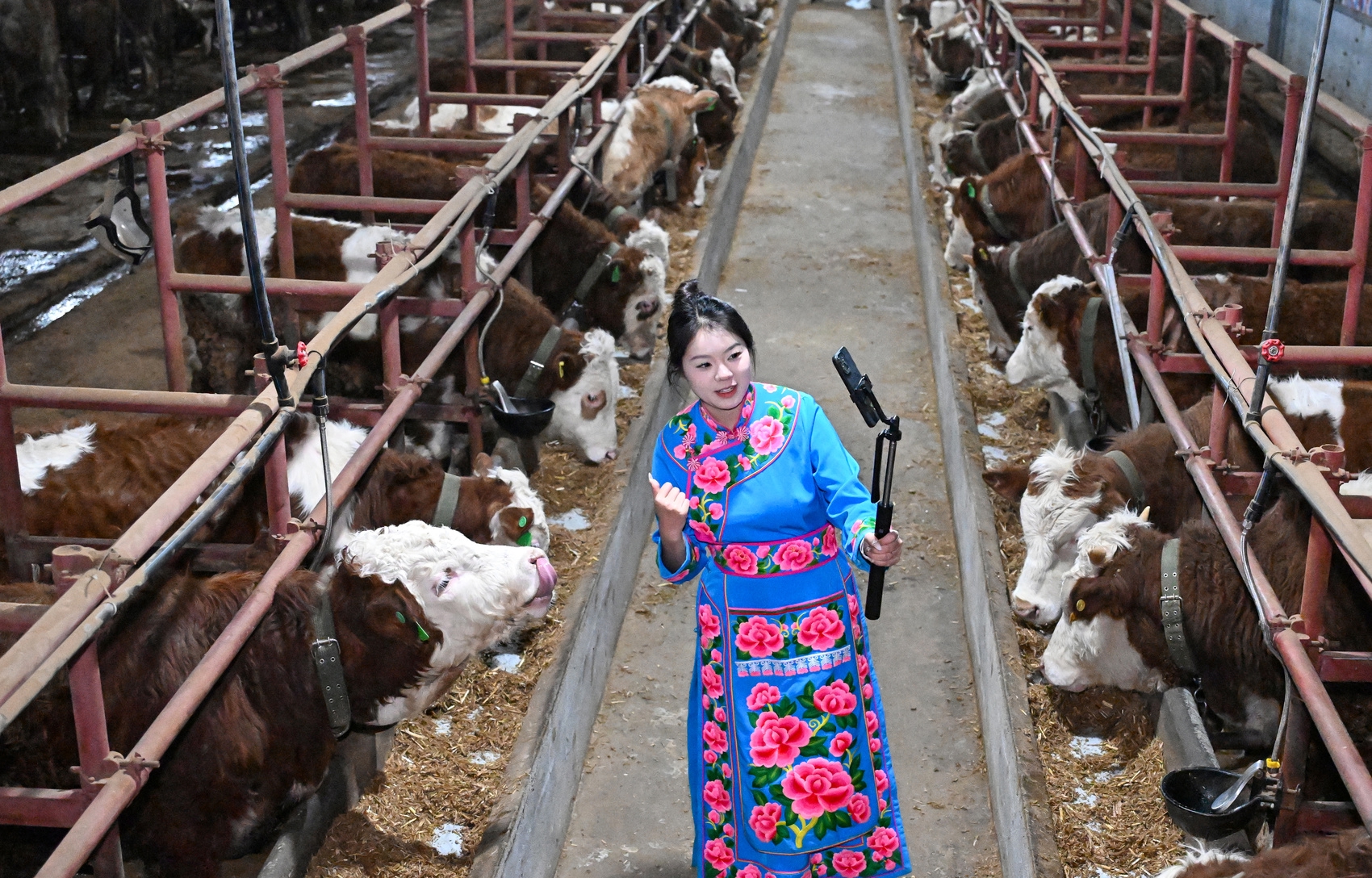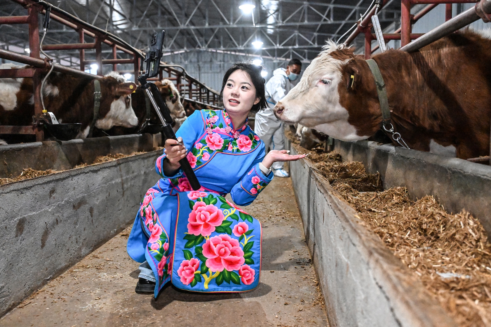2026年3月13日,阿坝州汶川县灞州镇周达村的主播张知英正在直播推荐家乡肉牛。大学毕业后,张知英返乡成为一名网络主播,采取“线上+线下”模式拓宽农产品销售渠道,为家乡代言。三年来,她先后获评“阿坝州乡村代言人”“汶川县乡村代言人”。