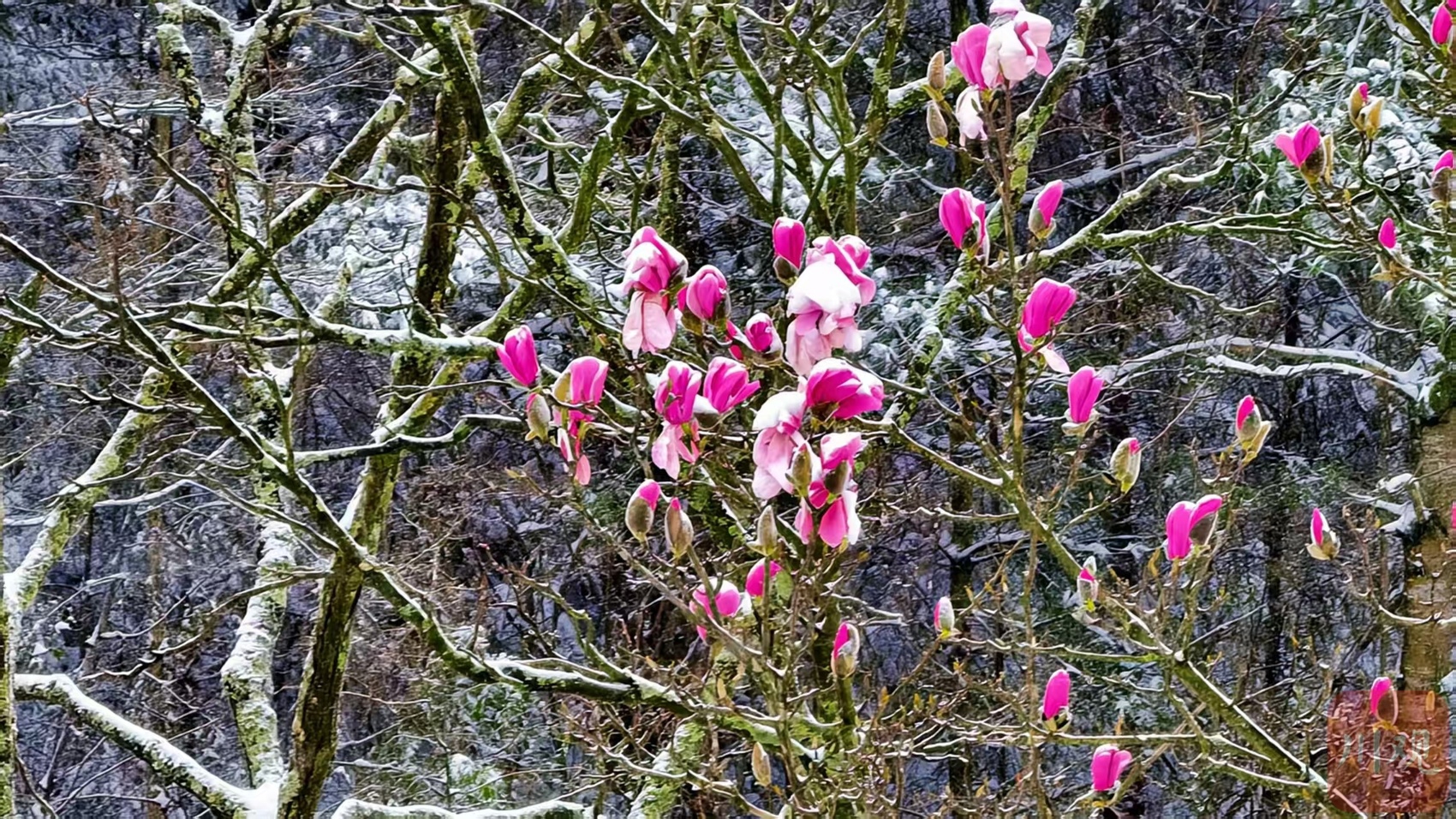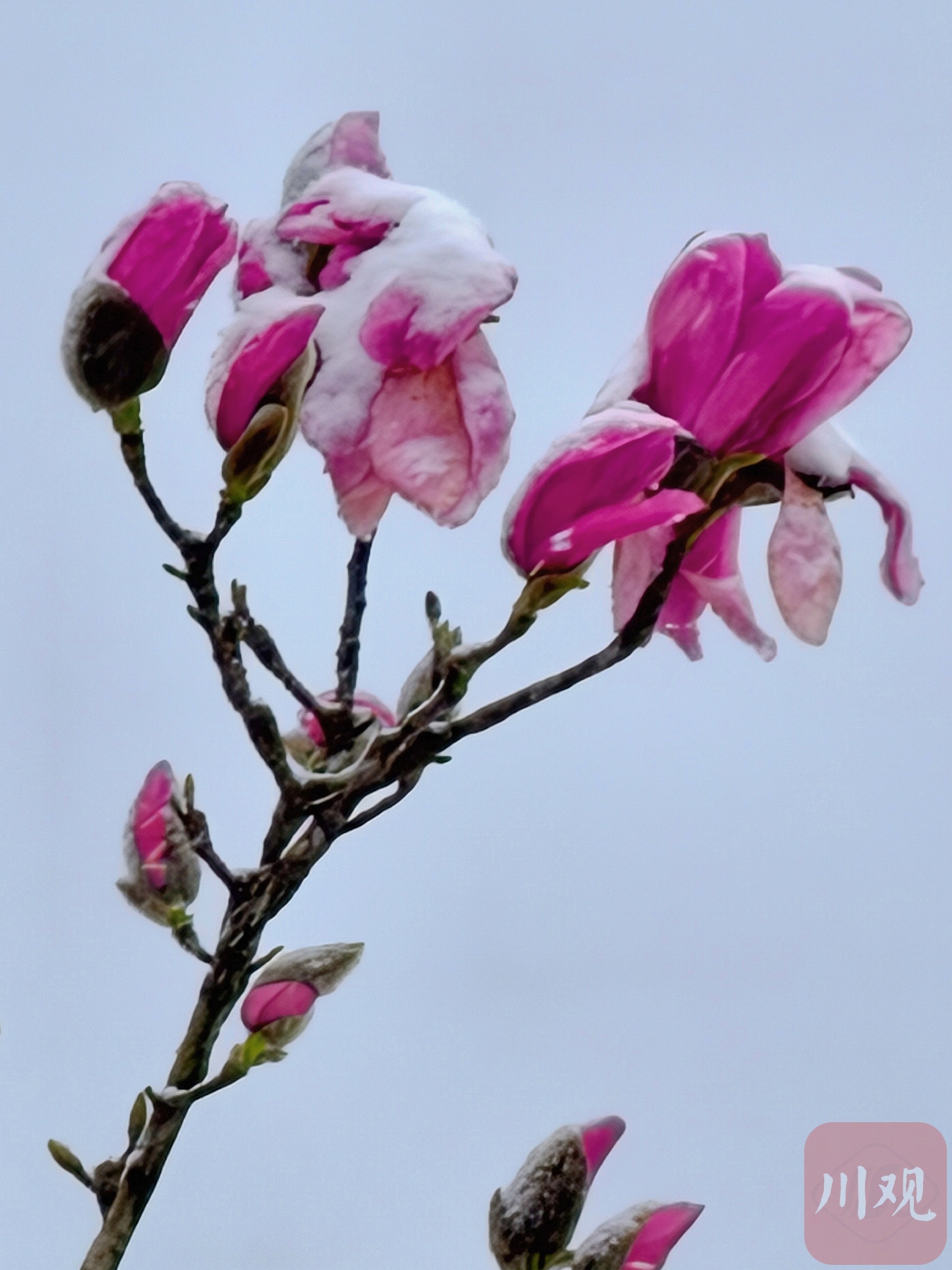 春雪落在盛开的玉兰花上,勾勒出“雪打春花” 的诗意。C视觉摄影师 罗倩