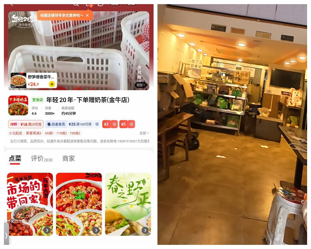 正值中午就餐时间,外卖平台上的“年轻20年·下单赠奶茶(金牛店)”,并未开展堂食服务,却依然标注“堂食店”。
