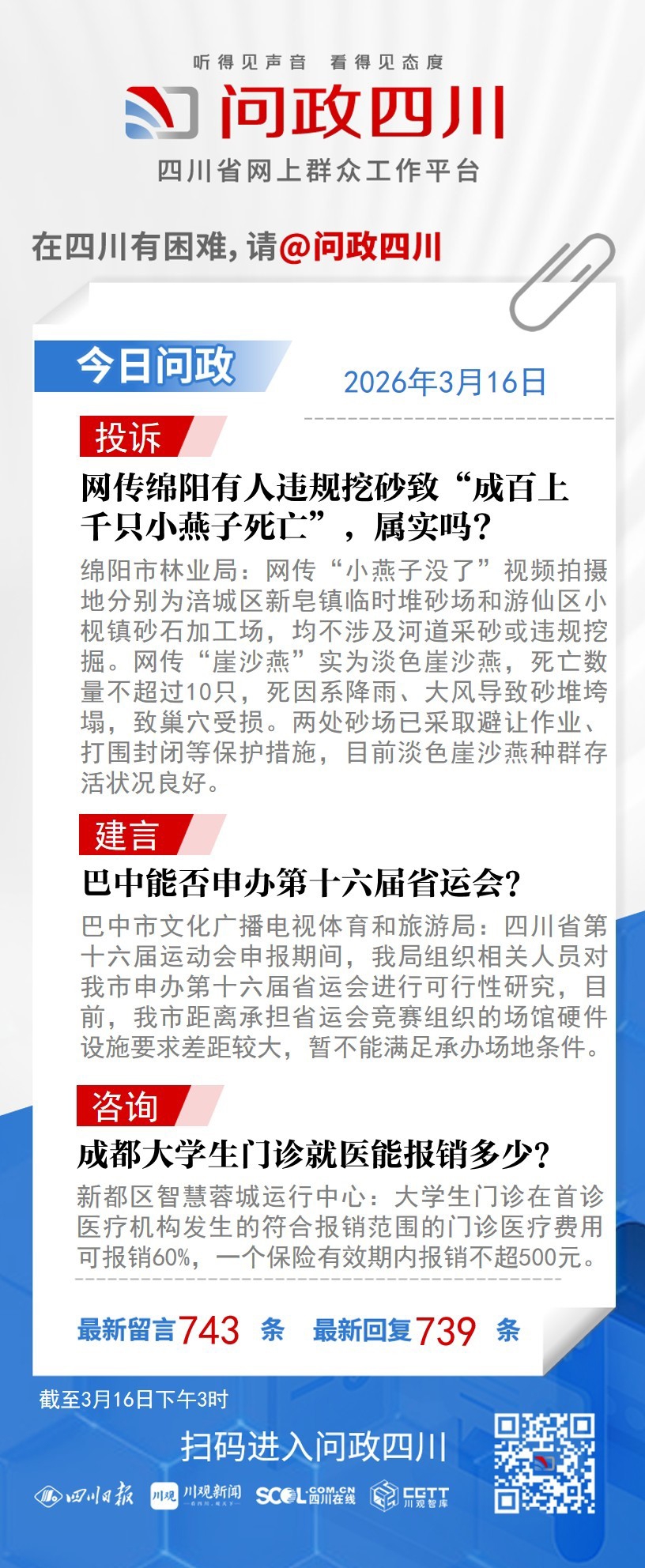 在四川有困难,找问政四川。如果您在四川遇到了操心事、烦心事、揪心事,请登录“四川省网上群众工作平台—问政四川”或拨打问政四川热线(028-96001)留言反映、求助或建议。我们将充分发挥平台的互动联系作用及舆论监督功能,第一时间传递民声,推动问题得以及时解决——听得见声音,看得见态度。