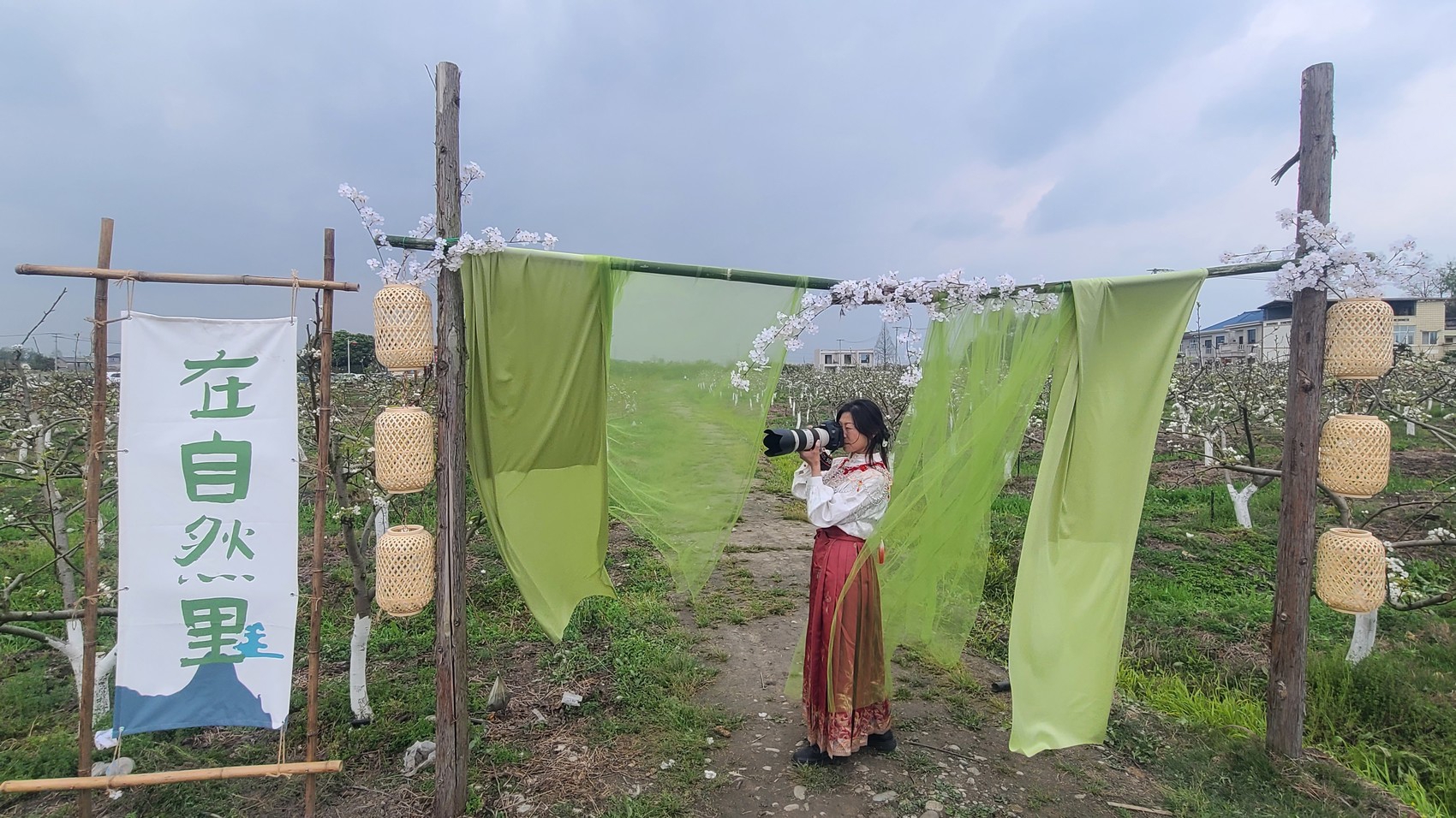 以梨园为背景,市场力量使出浑身解数。画家挥毫、摄影师追光、川音学生弹唱、汉服爱好者巡游……一场热热闹闹的乡村文旅合奏曲,在千亩梨园间徐徐展开。