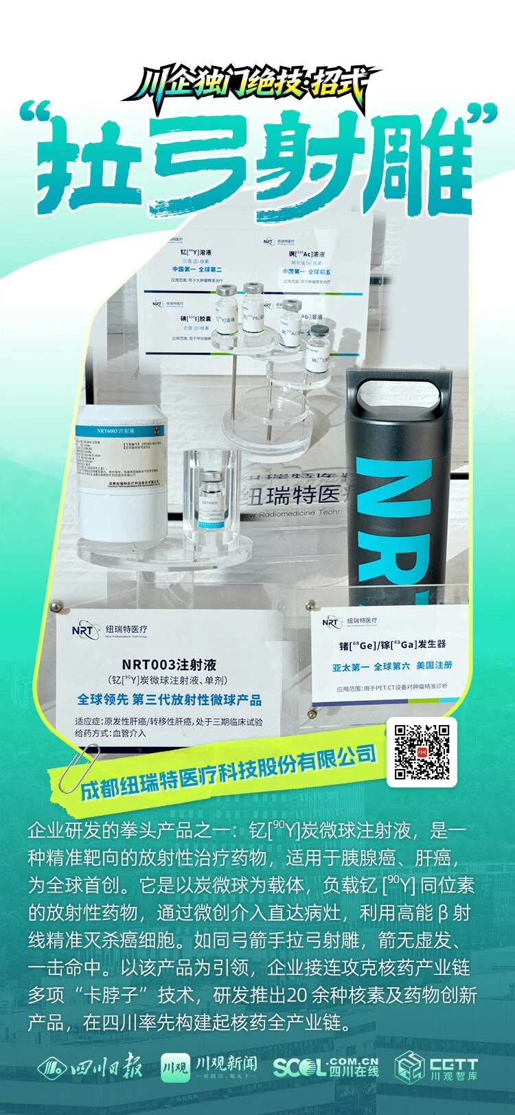 “拉弓射雕”——企业研发的钇[90Y]炭微球注射液,是一种精准靶向的放射性治疗药物,适用于胰腺癌、肝癌,为全球首创。它是以炭微球为载体,负载钇[90Y]同位素的放射性药物,通过微创介入直达病灶,利用高能β射线精准灭杀癌细胞,如同弓箭手拉弓射雕般,一击命中。以该产品为引领,企业接连攻克核药产业链多项“卡脖子”技术,研发推出20余种核素及药物创新产品,在四川率先构建起核药全产业链。