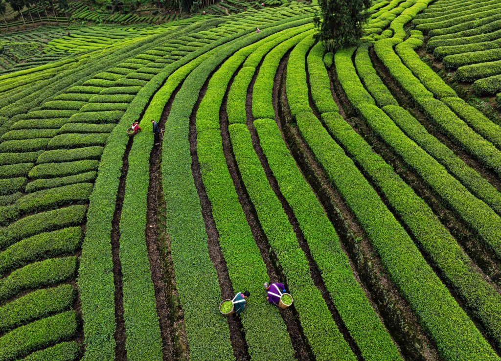 3月15日,在四川省乐山市沐川县利店镇,茶农在茶园采摘春茶。