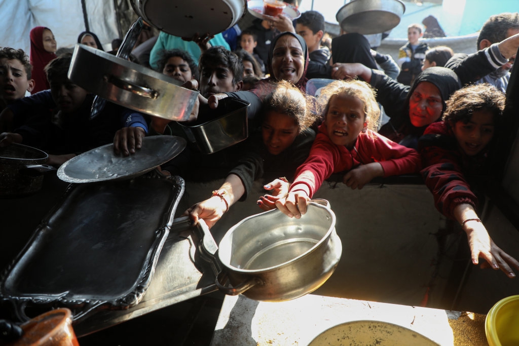 3月15日,在加沙地带北部拜特拉希亚地区,巴勒斯坦民众等待领取免费食物。