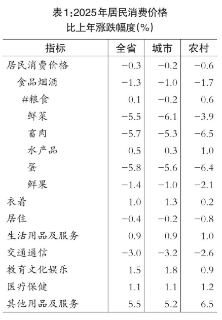 全年居民消费价格比上年下降0.3%,其中医疗保健类上涨1.1%,居住类下降0.4%,教育文化娱乐类上涨1.5%,食品烟酒类下降1.3%。工业生产者出厂价格比上年下降2.8%,其中生产资料价格下降3.0%,生活资料价格下降2.2%;工业生产者购进价格比上年下降3.6%。