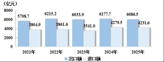 全年货物贸易进出口总额10318.1亿元,比上年下降1.3%。其中,出口额6086.5亿元,下降1.5%;进口额4231.6亿元,下降1.0%。