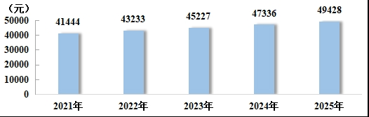 按常住地分,城镇居民人均可支配收入49428元,比上年增长4.4%。其中,工资性收入29016元,增长5.4%;经营净收入5834元,增长5.6%;财产净收入3401元,下降6.0%;转移净收入11177元,增长4.8%。城镇居民人均消费支出32181元,增长4.2%。八大类消费中,教育文化娱乐等支出增长较快。其中,城镇居民人均生活用品及服务支出增长9.6%,交通通信支出增长8.9%,教育文化娱乐支出增长10.3%。