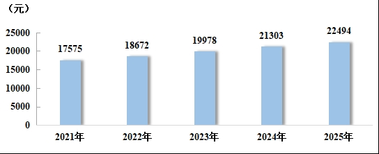 农村居民人均可支配收入22494元,比上年增长5.6%。其中,工资性收入7114元,增长7.5%;经营净收入8037元,下降0.2%;财产净收入681元,增长8.8%;转移净收入6662元,增长10.8%。农村居民人均消费支出19818元,增长5.0%。八大类消费中,交通通信等支出增长较快。其中,农村居民人均生活用品及服务支出增长6.6%,交通通信支出增长7.1%,教育文化娱乐支出增长6.5%。