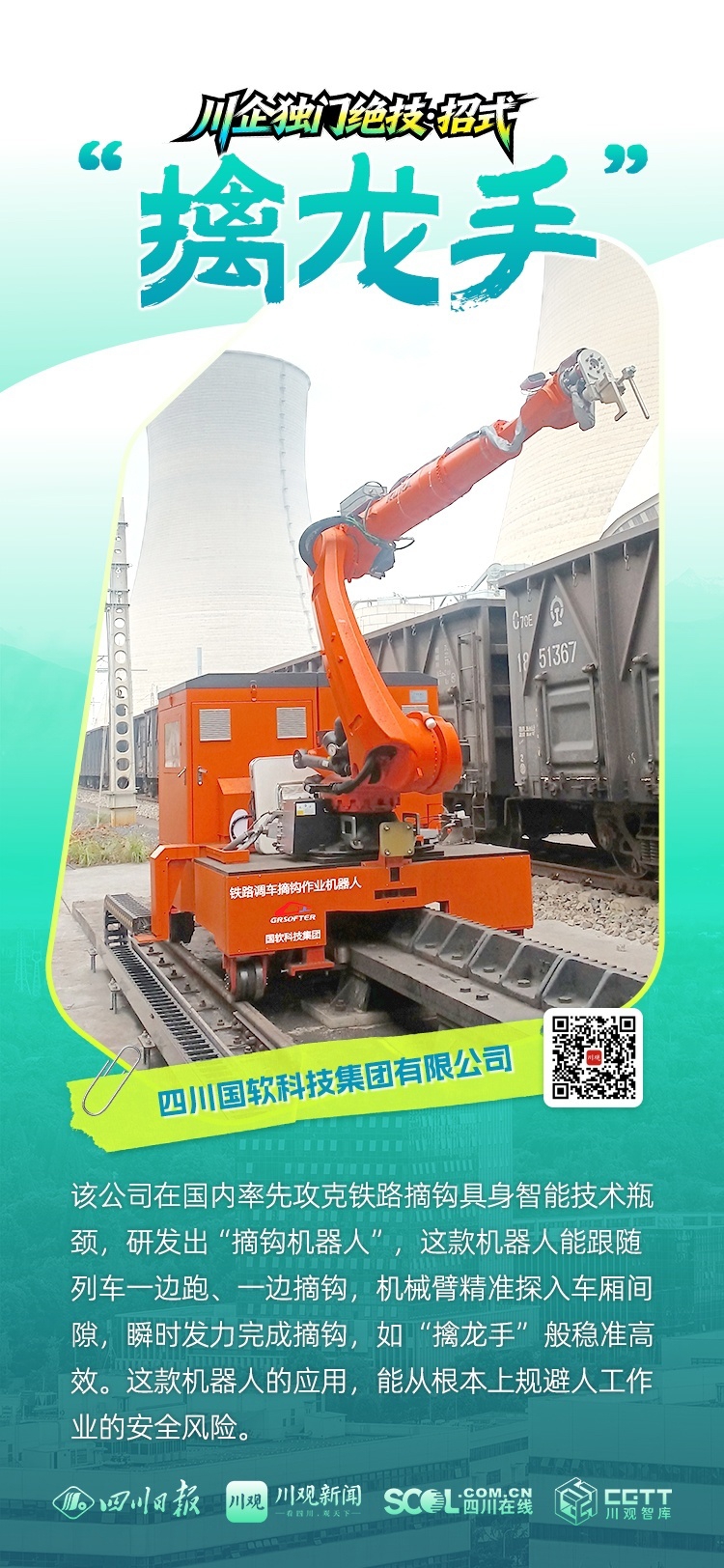 这台身手不凡的编组场“擒龙手”,由四川国软科技集团有限公司研发制造。这家公司在国内率先攻克铁路摘钩具身智能技术瓶颈,实现摘钩无人化操作。场景与核心技术融合,这家川企如何练就“独门绝技”?近日,四川在线记者走进该公司,一探究竟。
