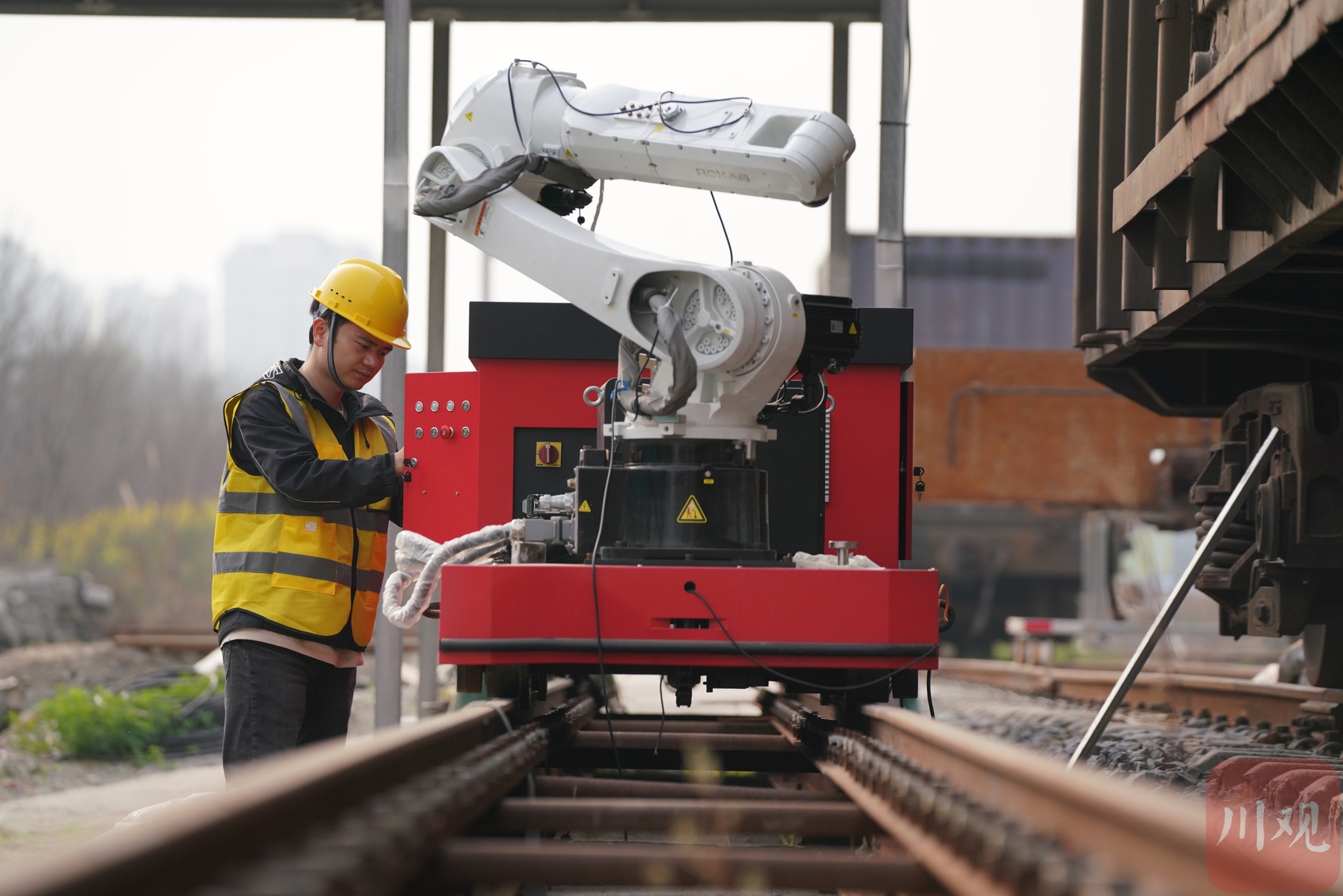 在成都市金牛区的中铁轨道交通高科技产业园内,一段测试铁轨上,几节货运车厢正静静待命。两节车厢由沉重的车钩紧紧相连,只见机械臂精准探入车厢间隙,抓取、提拉,“咔哒”一声,车钩应声脱开,动作干脆利落。