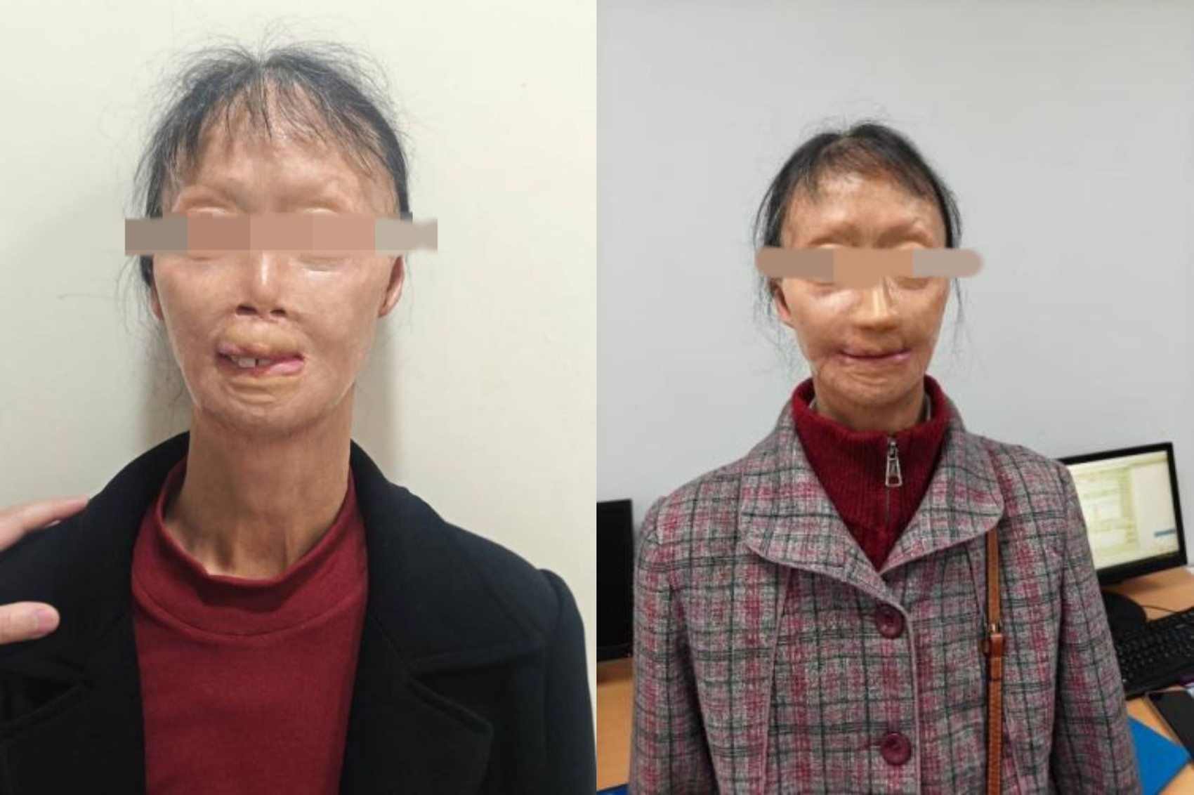 上世纪80年代,一场突如其来的汽油爆炸,让年轻的周女士遭遇全身大面积重度烧伤,火焰吞噬了她的面容——面部严重毁损、鼻畸形、口周瘢痕挛缩引发小口畸形、眼睑长期外翻无法闭合、耳廓部分缺损,加之手指残缺,生活起居备受煎熬。