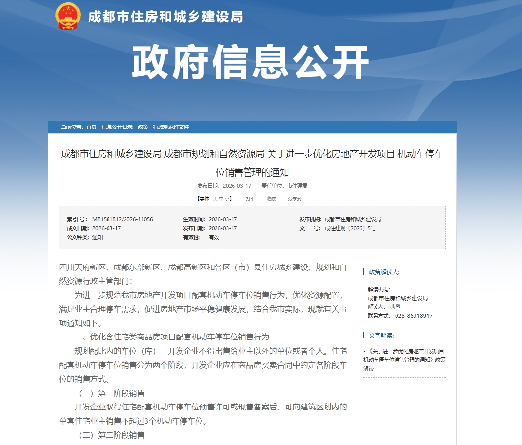 3月17日,成都市住房和城乡建设局、成都市规划和自然资源局联合发布《关于进一步优化房地产开发项目 机动车停车位销售管理的通知》。