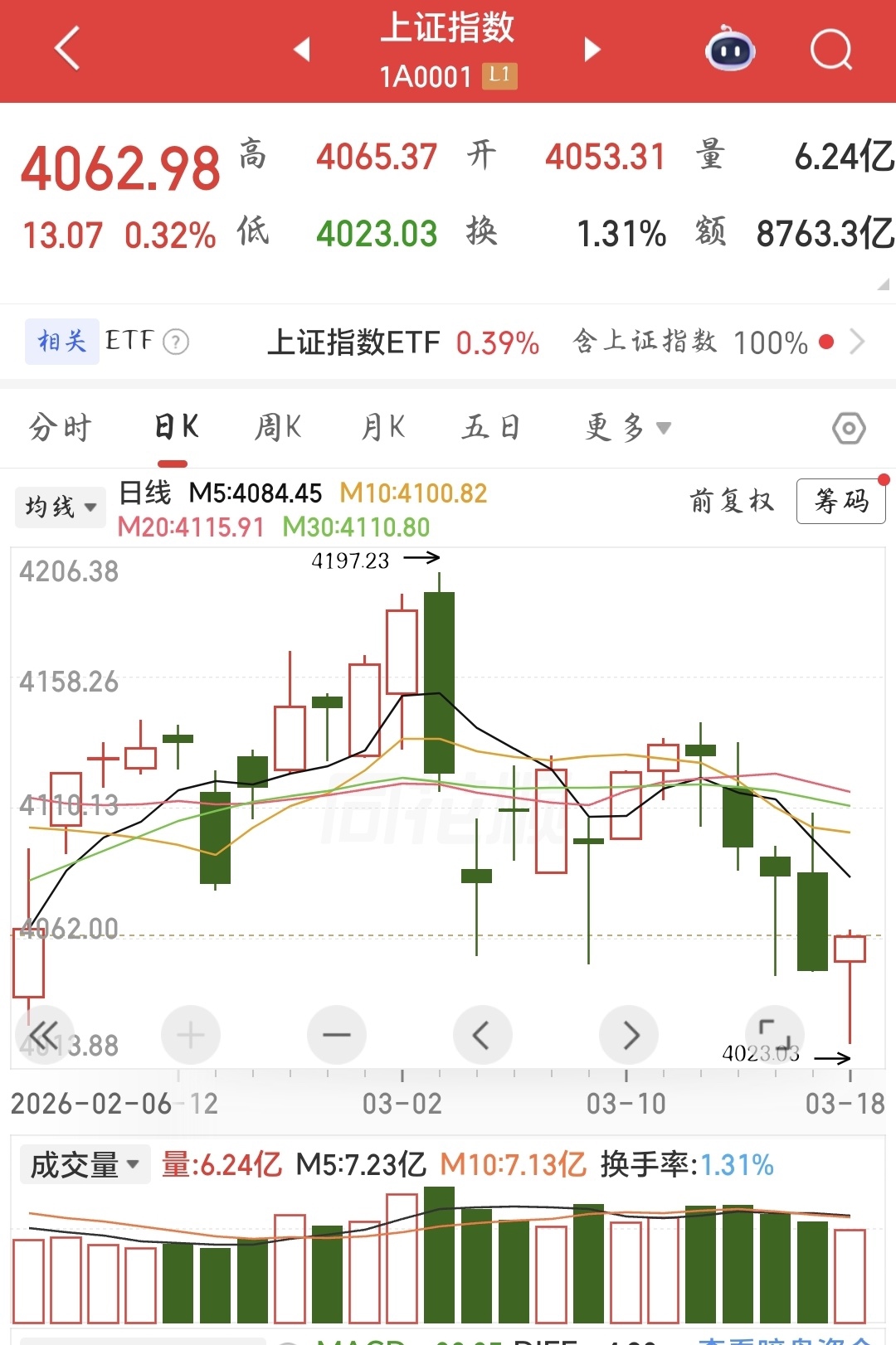 3月18日,A股三大指数集体收红,沪指终结此前四个交易日的连跌态势。截至收盘,上证指数涨0.32%,报4062.98点;深证成指涨1.05%,报14187.80点;创业板指涨2.02%,报3346.37点。全市场超3500只个股上涨,但成交额萎缩,全天成交2.06万亿元,较前一交易日减少1635亿元,创本月以来新低。缩量反弹的格局,反映出市场当前仍处于谨慎修复的情绪之中。