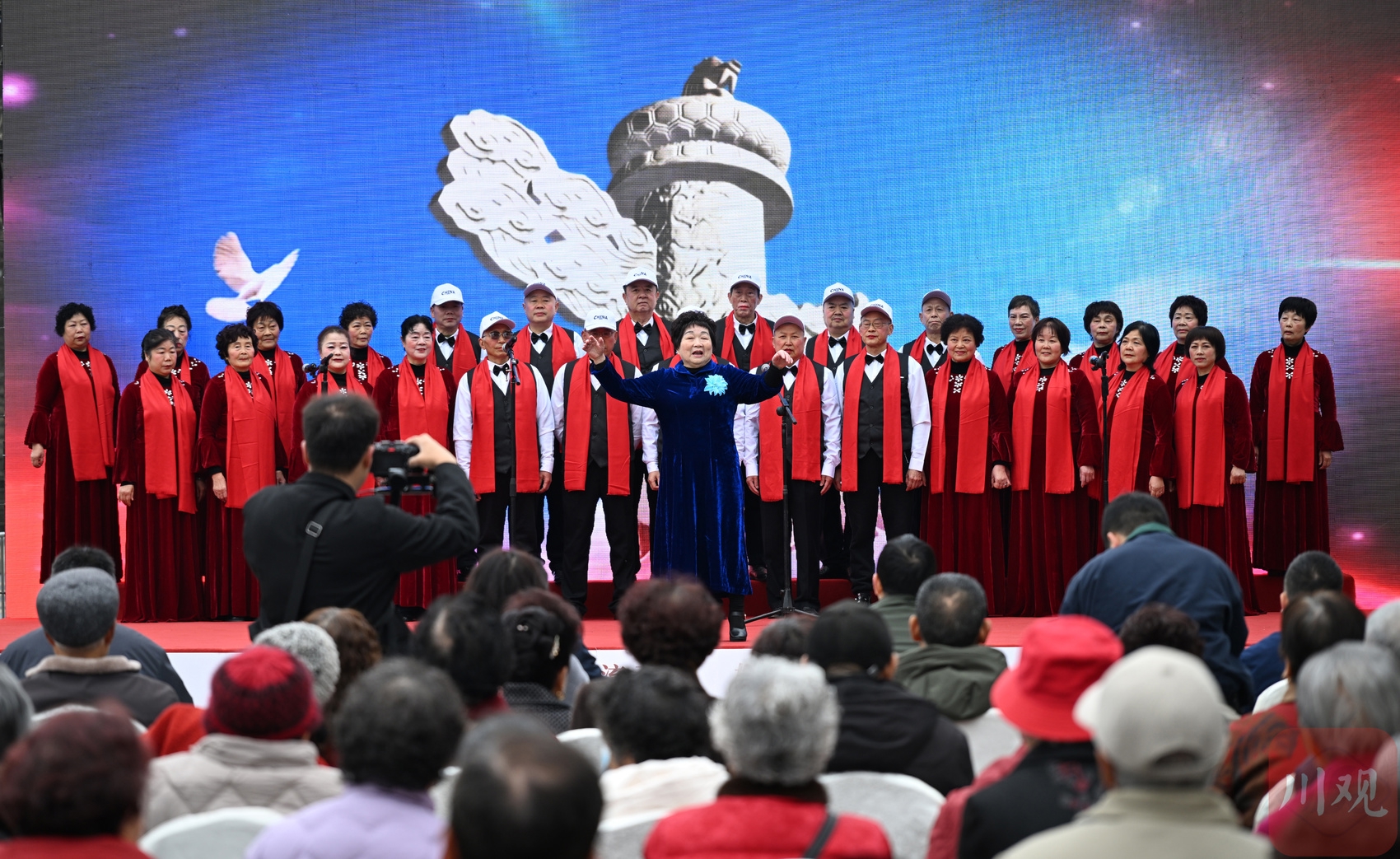 2026年3月18日,在成都市双流区黄龙溪镇廊桥广场,“候鸟”旅居老人表演合唱。