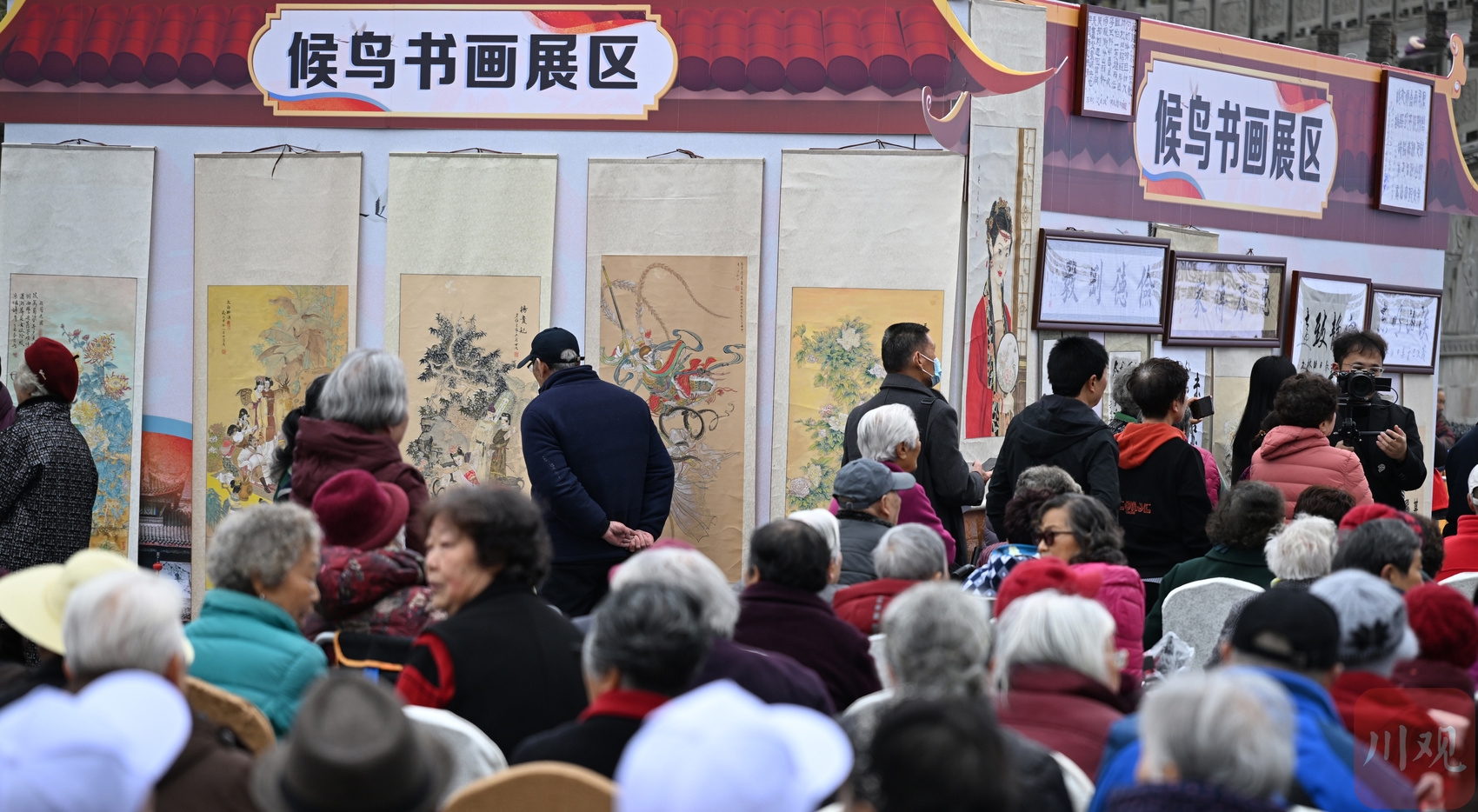 2026年3月18日,在成都市双流区黄龙溪镇廊桥广场,“候鸟”旅居老人书画展迎客来。