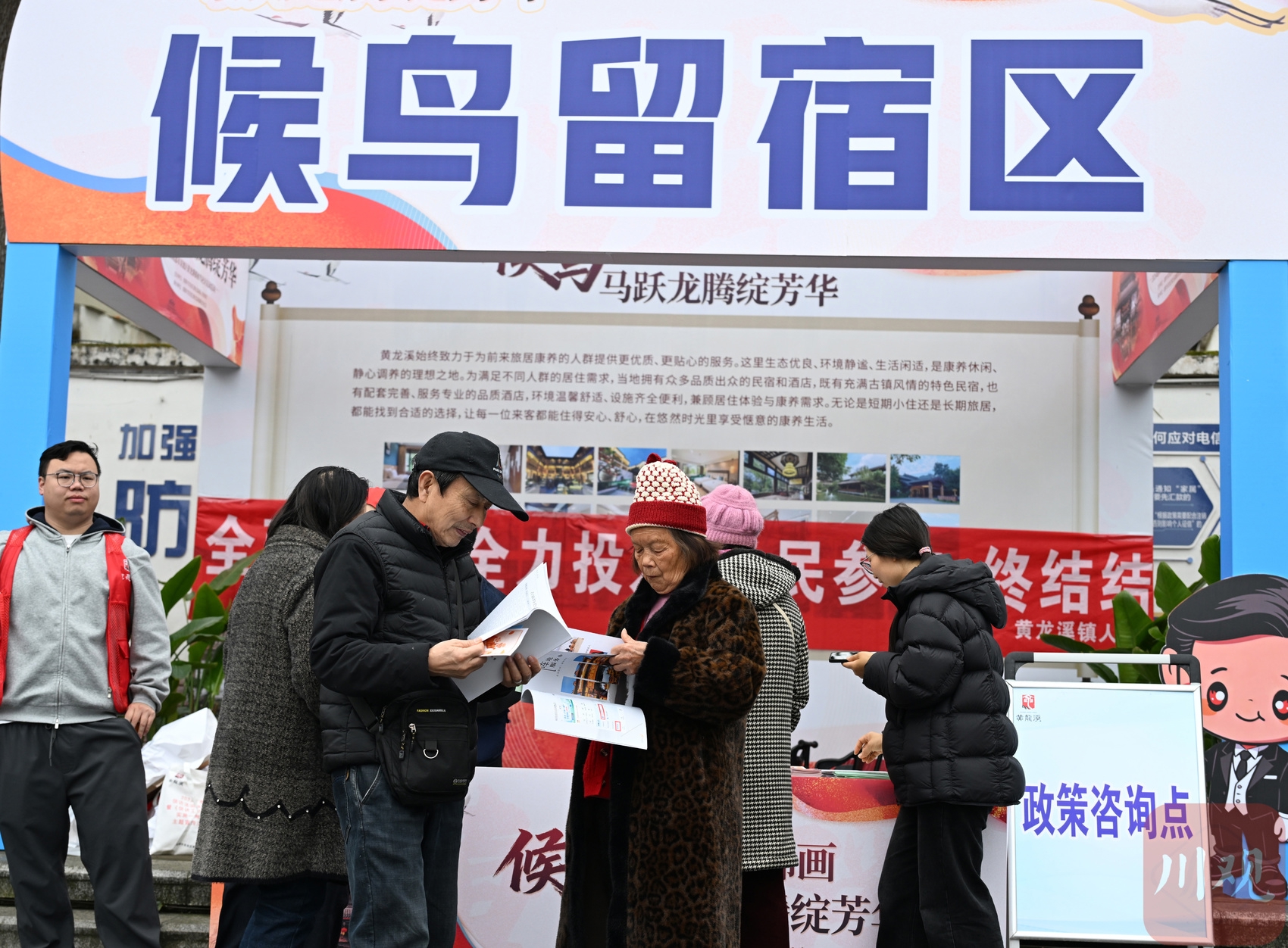 2026年3月18日,在成都市双流区黄龙溪镇廊桥广场,老人了解相关政策。