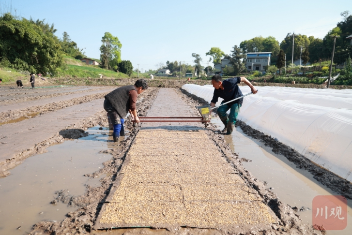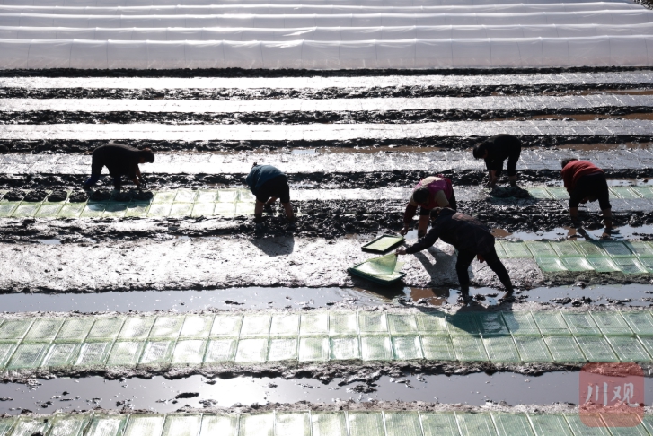 春耕正当时。3月16日,隆昌市石碾镇白鹤林村,连片水田已翻耕完毕,看起来温润油滑,镜面般铺展在浅丘之间。村民们正忙着铺育秧盘、撒稻种。