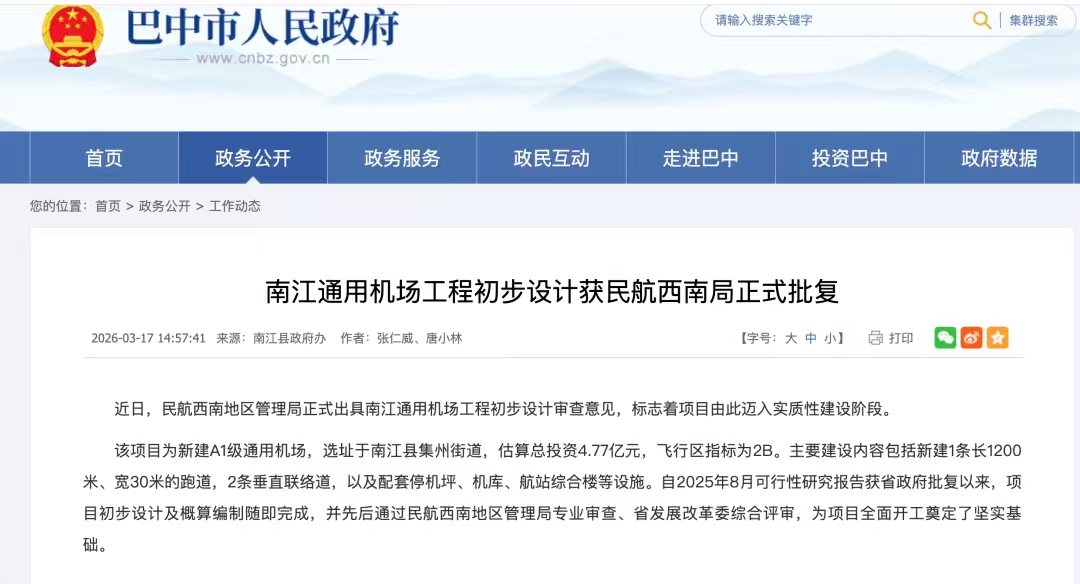 近日,中国民用航空西南地区管理局正式出具南江通用机场工程初步设计审查意见,标志着项目由此迈入实质性建设阶段。