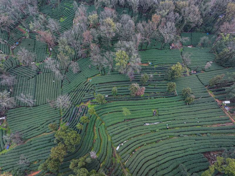 3月19日,梅家坞村的茶农在茶山上采摘西湖龙井“明前茶”(无人机照片)。