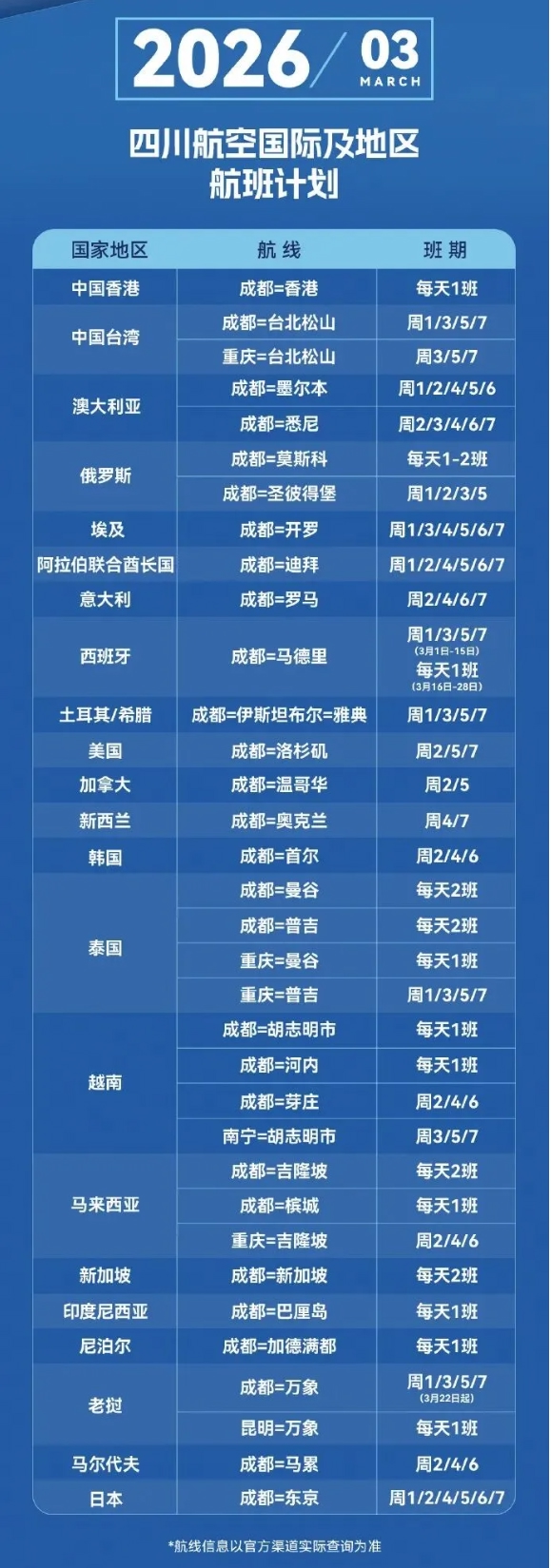 川航3月国际及地区航班计划。