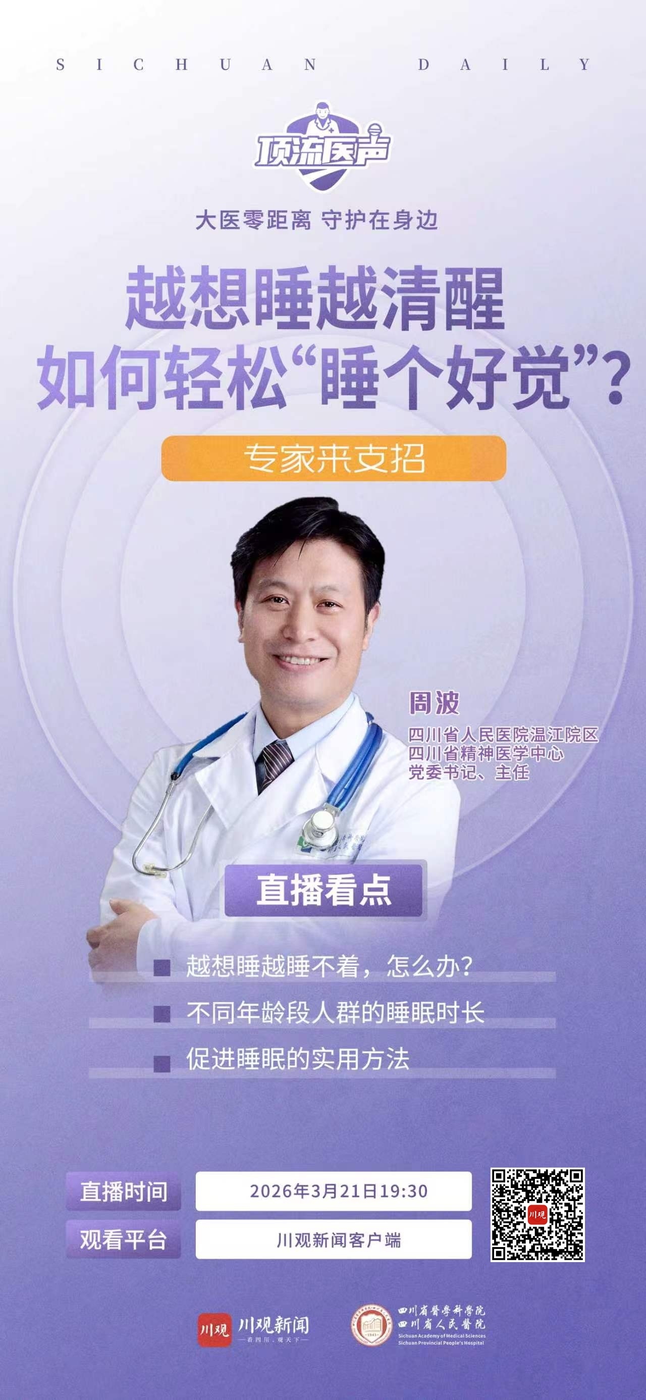 3月21日是世界睡眠日,川观新闻特别邀请到四川省人民医院温江院区/四川省精神医学中心专家做客“顶流医声”直播间,帮大家科学拆解睡眠难题,走出睡眠焦虑,找回好睡眠。