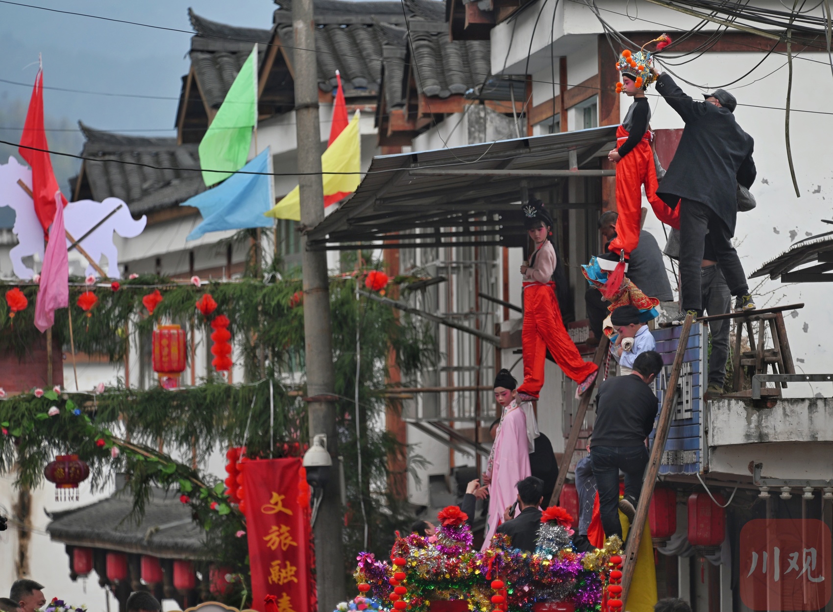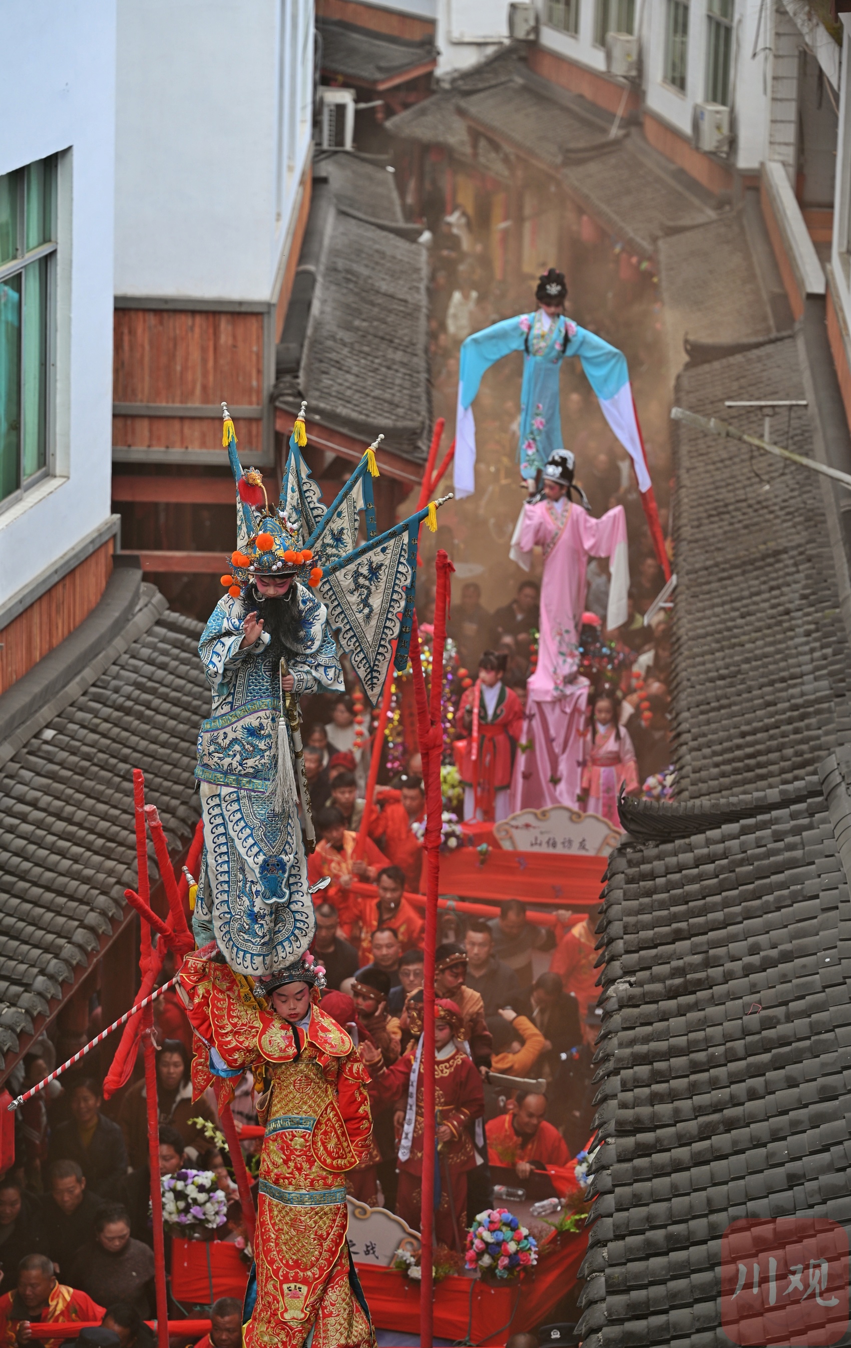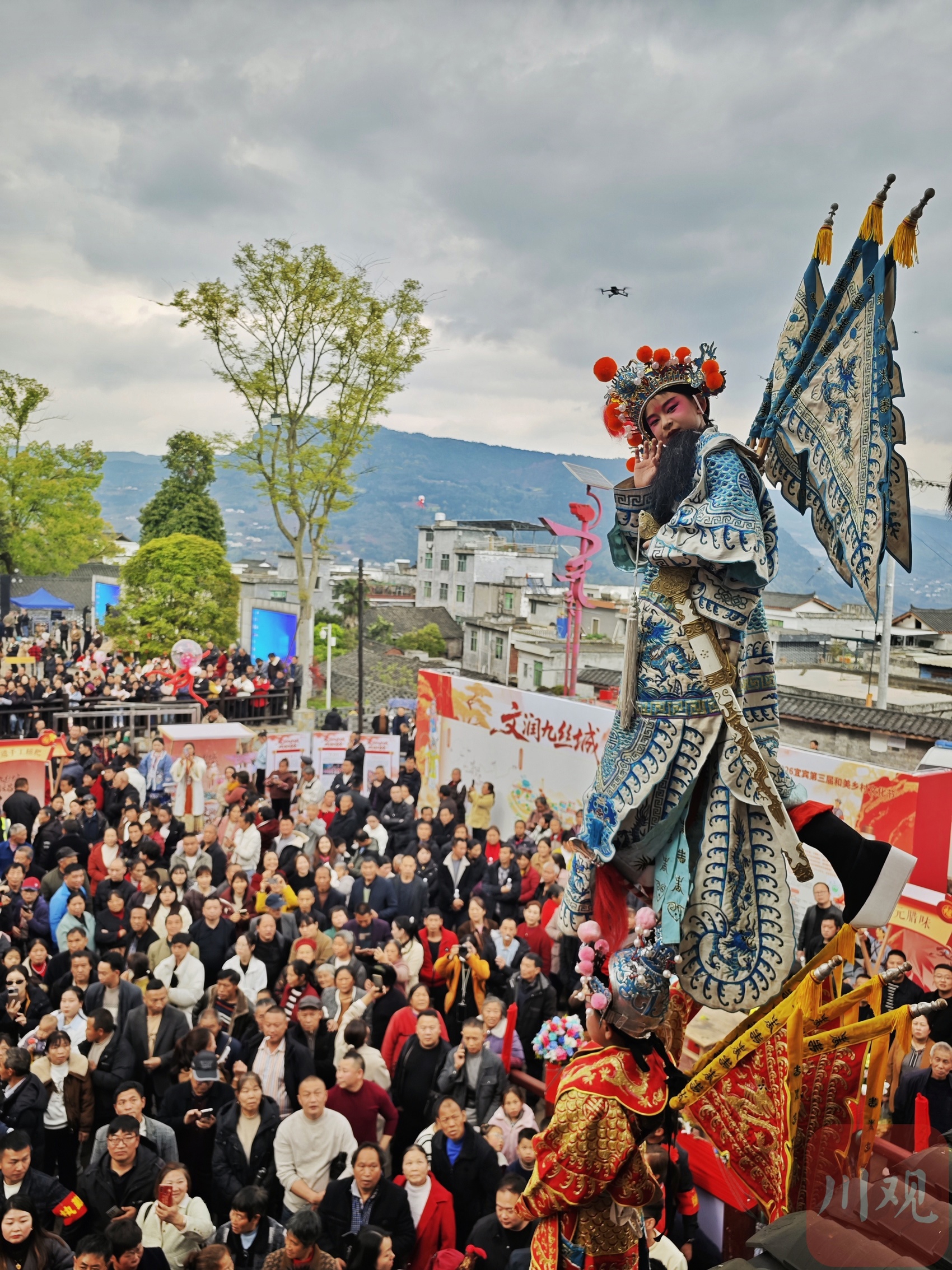 现场,非遗建武僰道木台铁桩巡游表演是绝对的视觉焦点,几米高的桩架直指云霄,小演员们于桩顶定格造型,身姿轻盈如燕,稳若磐石,各种民俗表演穿行其间,与“龙抬头”习俗交相辉映。