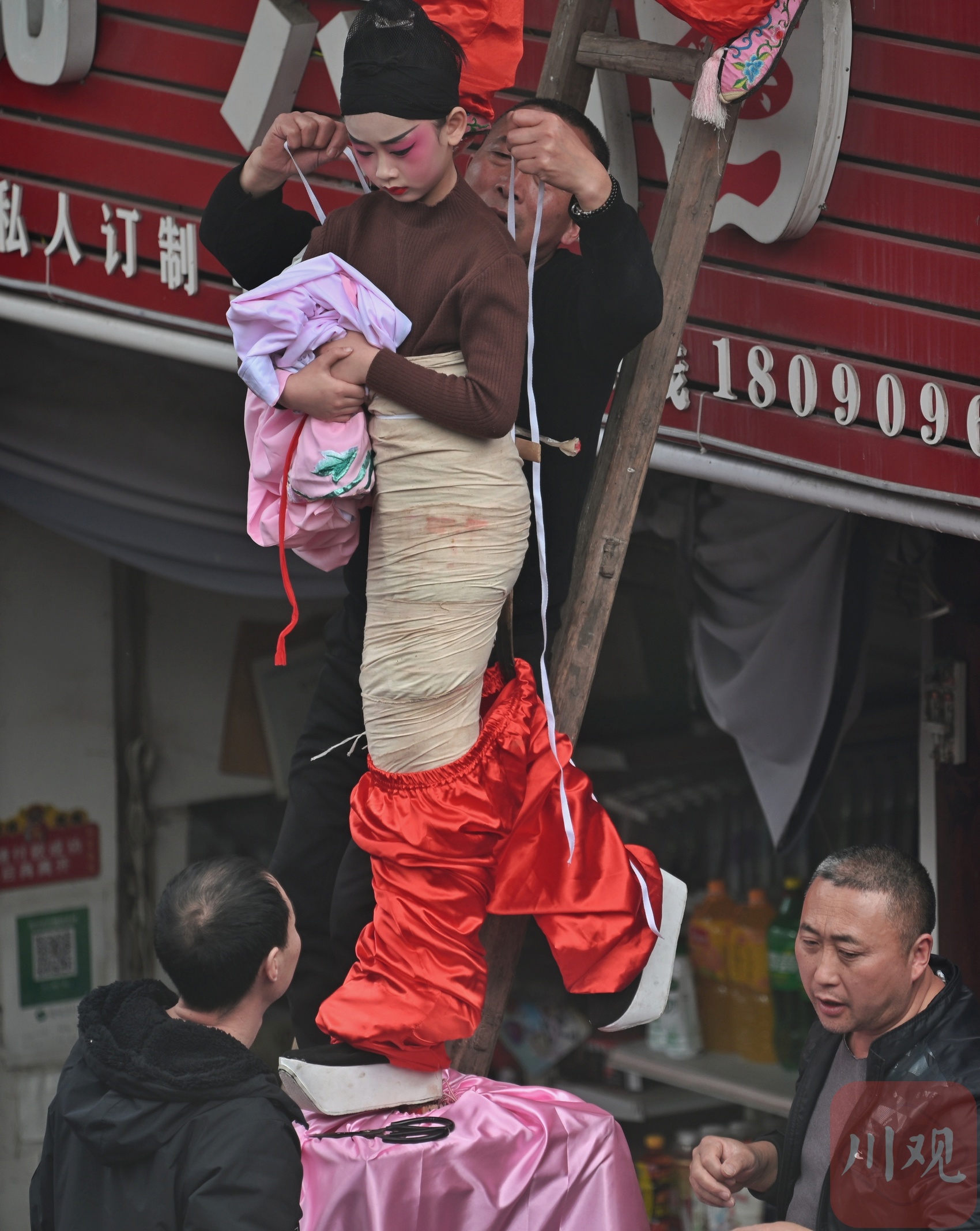 手工艺人正在对高桩上的演员进行造型。