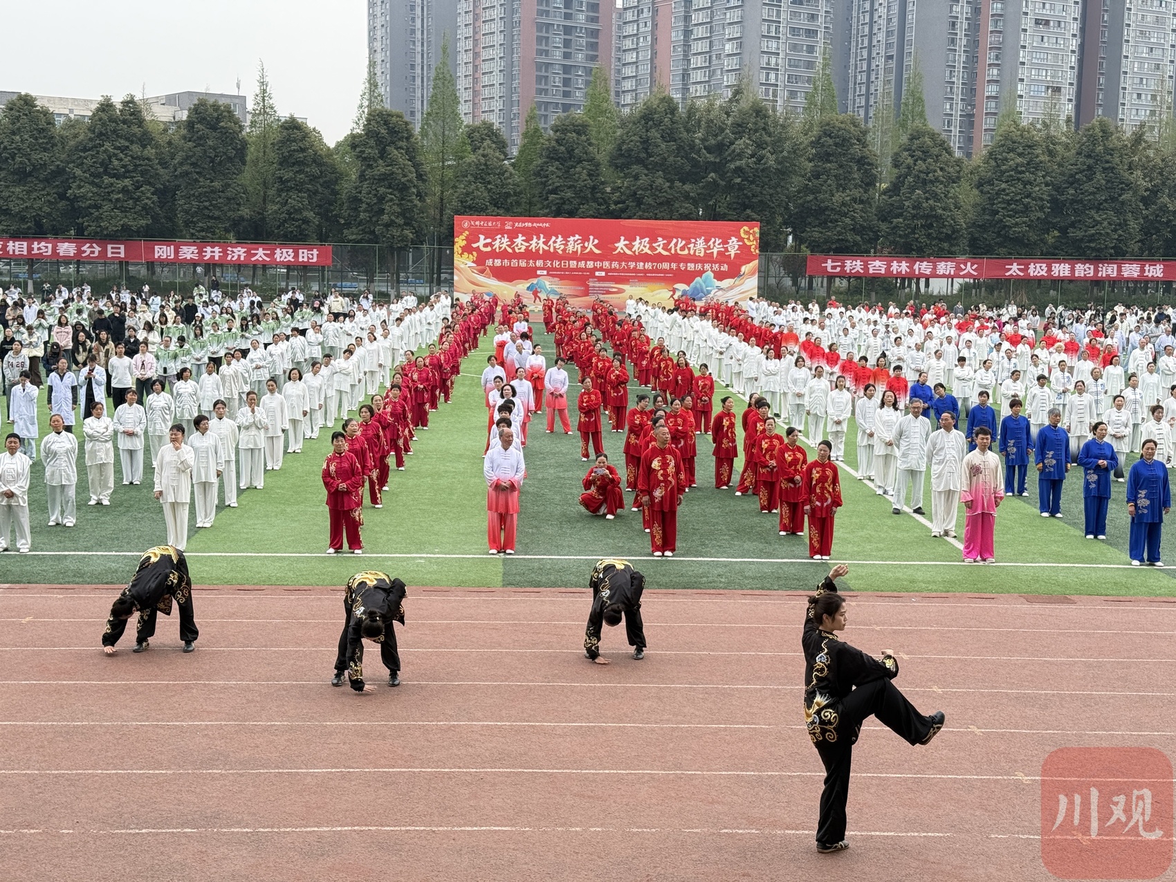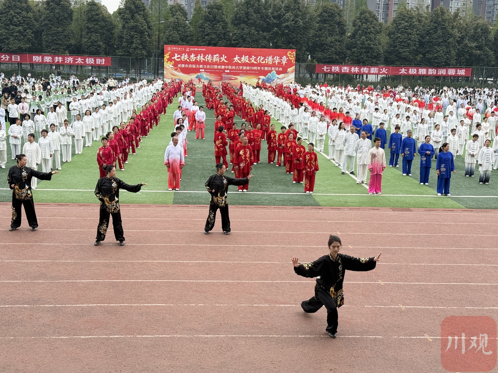 现场,成都中医药大学学生带来的《杏林武魂》将四川非遗、舞龙舞狮与太极元素巧妙融合,赢得阵阵喝彩。来自各流派的传承人与运动员依次登场,集中展示了陈氏、杨氏、吴氏、武氏、孙氏、42式太极拳,以及八段锦、易筋经、太极养生杖、导引养生功十二法。随后,在校园田径场、大草坪、博物馆前后、图书馆前后、太极大道、涌泉湖边等八个点位,万人齐练二十四式简化太极拳,场面蔚为壮观。同时,操场一角还特别增设了“AI+太极智能系统专属体验区”,吸引众多民众驻足体验。
