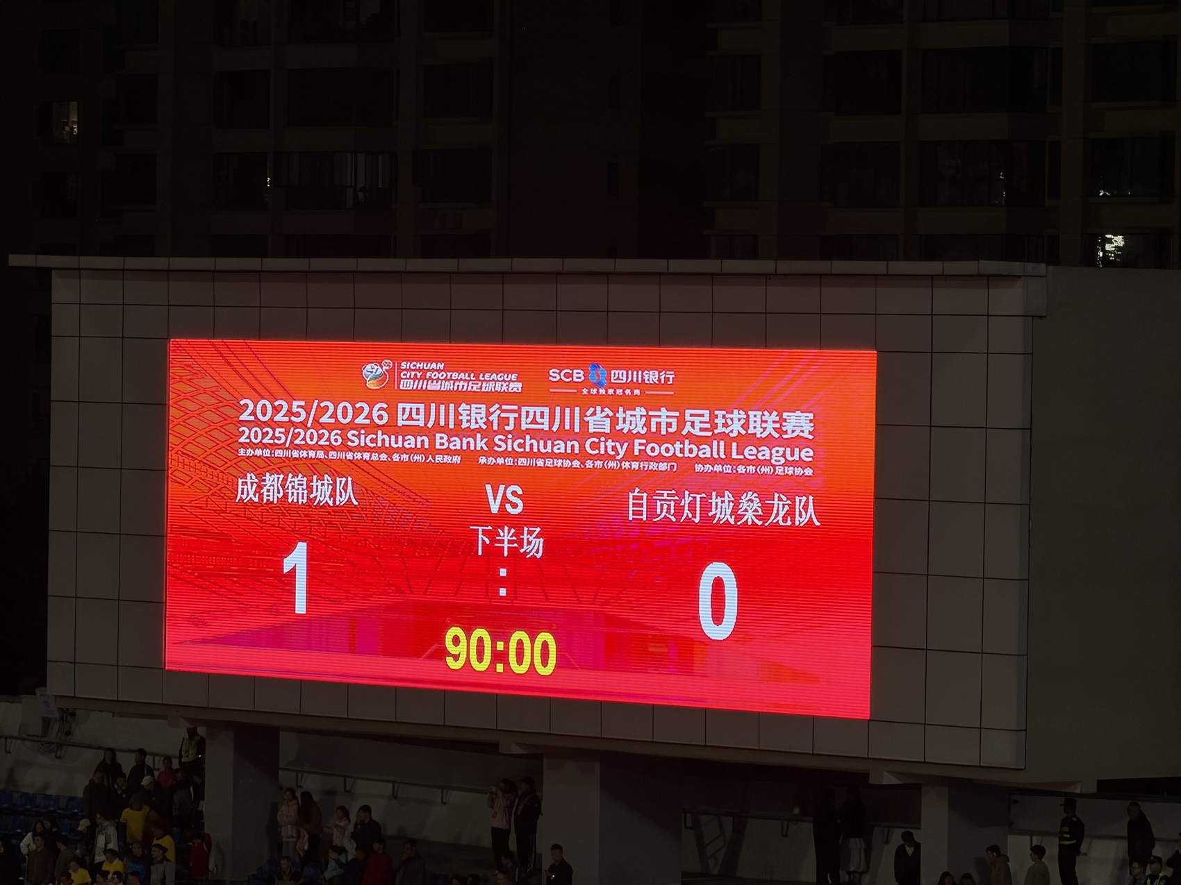 易边再战,自贡队发起猛烈反扑,多次在成都队门前制造险情。比赛第84分钟,自贡上演换人“大戏”,成都队防线稳扎稳打,力保球门不失。比赛进入伤停补时阶段,成都队接连获得多次射门机会,均未能转化为进球。自贡队随即发动反击,也被成都队及时解围。