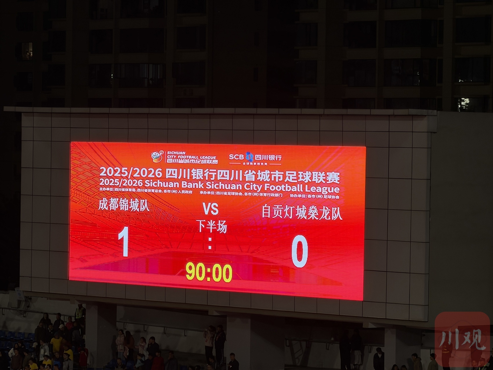 在双流体育中心,成都锦城队坐镇主场迎战自贡灯城燊龙队。上半场第22分钟,成都队率先破门,并将1比0的比分保持到终场。伤停补时阶段,主队接连获得多次射门机会,但均未能转化为进球。