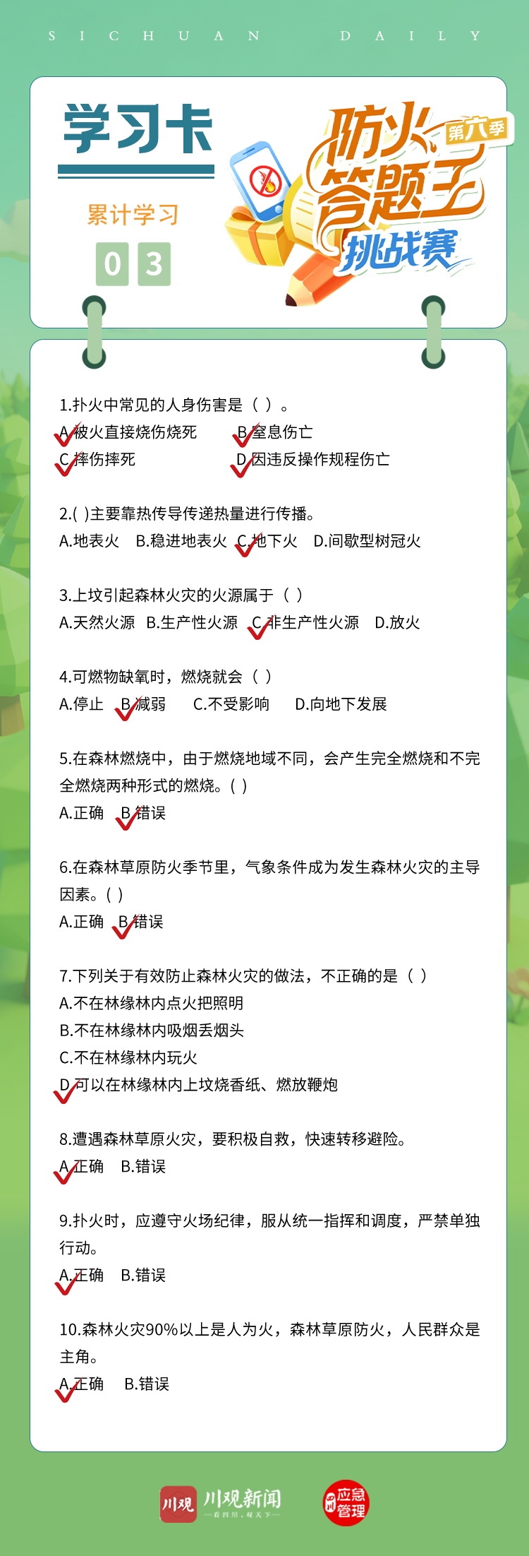 川观“漏题王”准时更新,防火“答题王”第六季学习卡新鲜出炉,10道核心考点直接划重点!从扑火人身伤害类型、火源分类、燃烧规律,到火场避险规范、防火禁令等实操知识,拆解考点,帮你轻松得分,再也不怕答题卡壳!不用费心找资料,几分钟打卡学习,既能为答题冲榜攒足底气,又能筑牢身边的防火安全线。快收藏本期学习卡,跟着川观一起打卡学习吧!