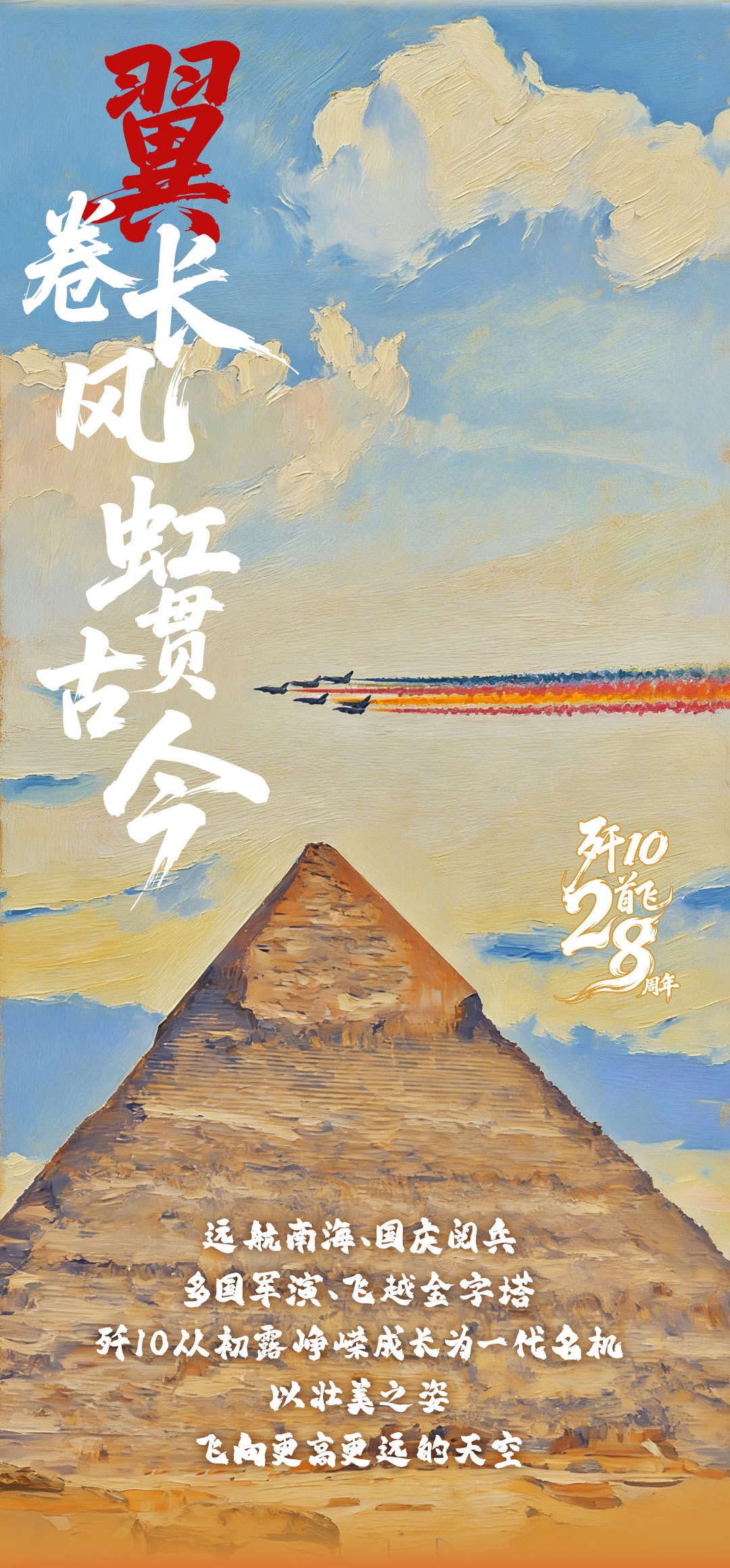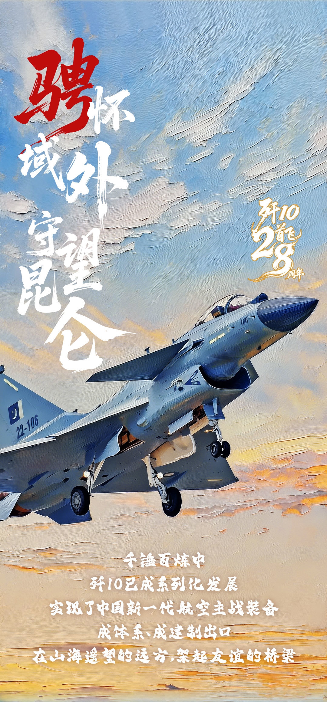 进入新世纪,歼-10成建制装备部队很快形成作战能力,中国空军从此有了自主研制的中坚力量。28年来,歼-10与天海云涛相伴,远航南海,参与国庆阅兵、多国军演,飞越金字塔,在千锤百炼中已形成系列化发展,实现了中国新一代航空主战装备成体系、成建制出口。
