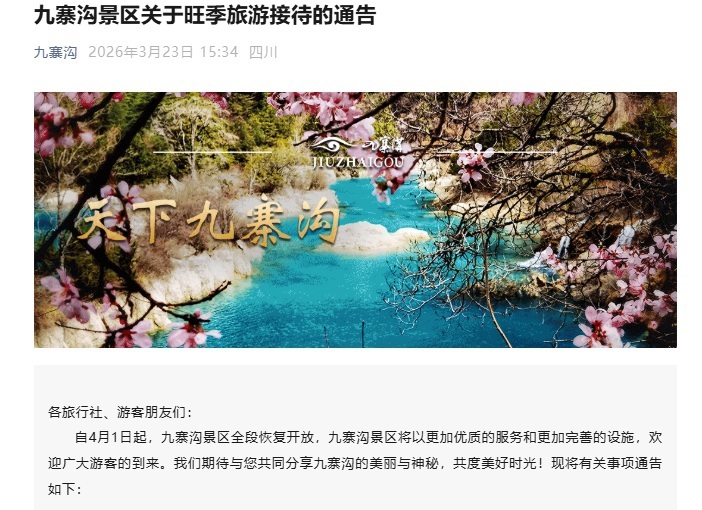 3月23日,九寨沟管理局发布通告,自4月1日起,九寨沟景区全段恢复开放,实行旺季旅游接待政策。