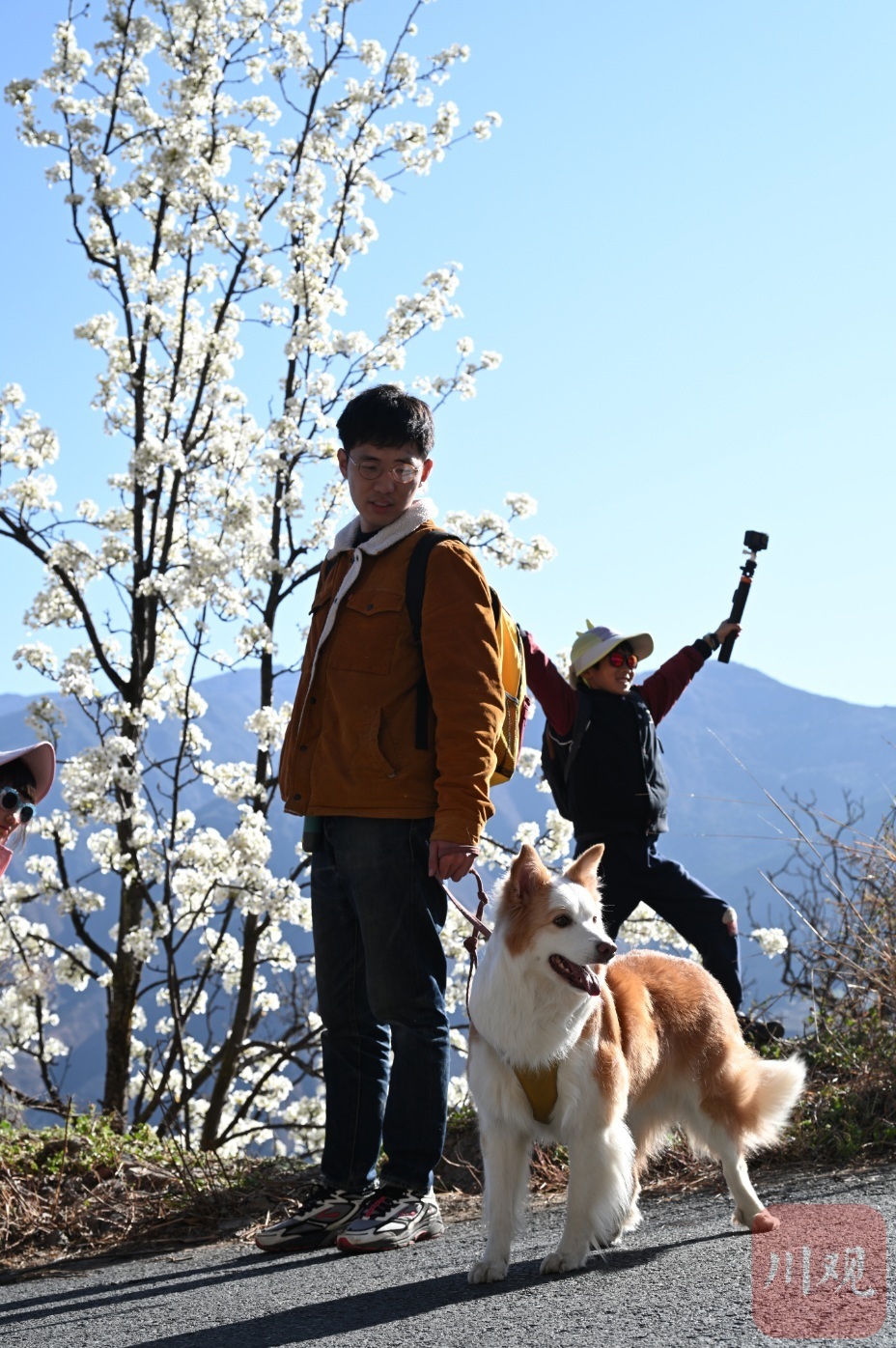 游客携宠打卡梨花。