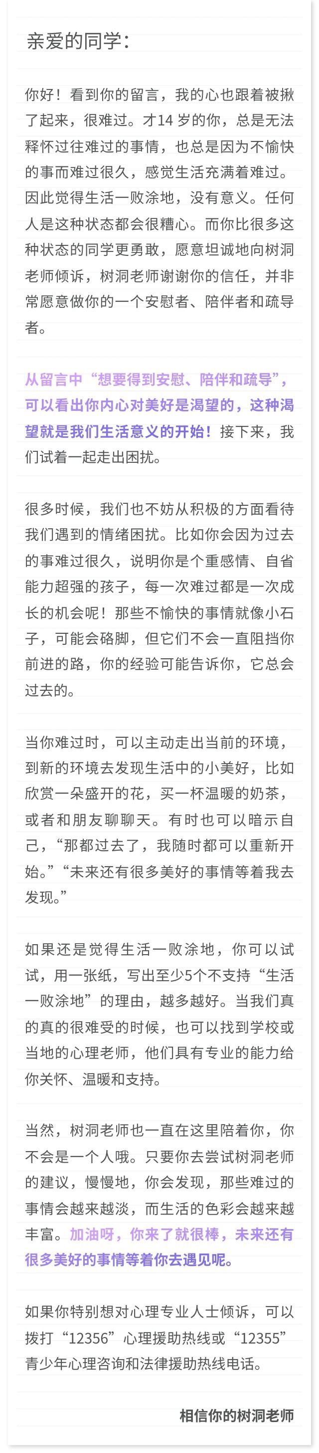 一位14岁初中女生:我常常觉得自己的生活一败涂地,总是会因为一些不愉快而难过很久,有时候经常发呆就会想起以前的很多自己无法释怀的难过事情,我总会觉得活着没有意义,我想要一个安慰一个陪伴一个疏导。
