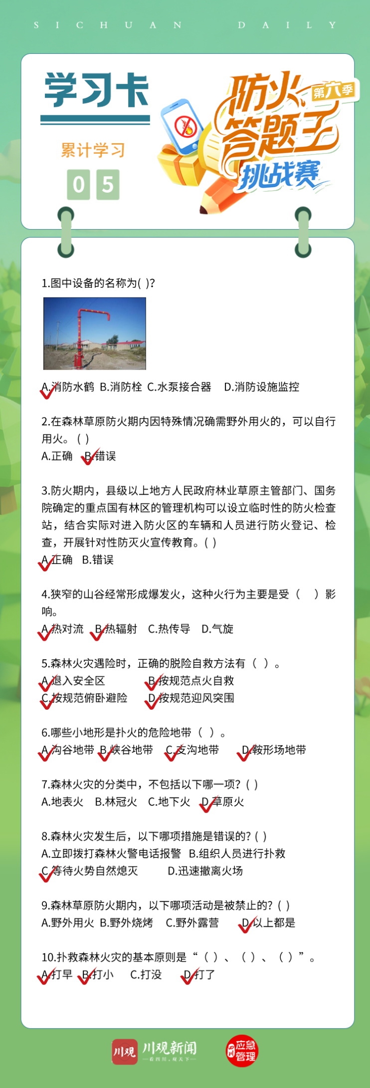 今日份防火“答题王”学习卡准时更新,答题冲分不迷路!本期学习卡聚焦设备识别、用火禁令、火场避险、扑火原则等知识点,花几分钟快速掌握。春季防火关键期,严禁违规野外用火,牢记扑火打早、打小、打了基本原则,掌握科学避险方法。既能答题冲分,又能筑牢森林草原防火安全线。快收藏学习卡,每日打卡争做防火“答题王”!