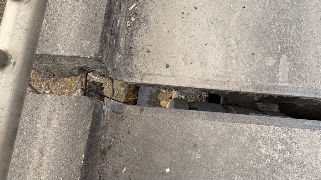 同时,记者观察到,与缝隙连接的护栏也存在部分裂缝情况,有的护栏底部甚至有部分裸露钢筋和钢管存在弯曲或断裂现象。