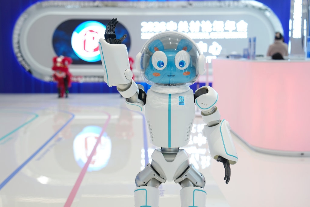 3月24日,在中关村论坛年会新闻中心内,一台机器人向观众招手。