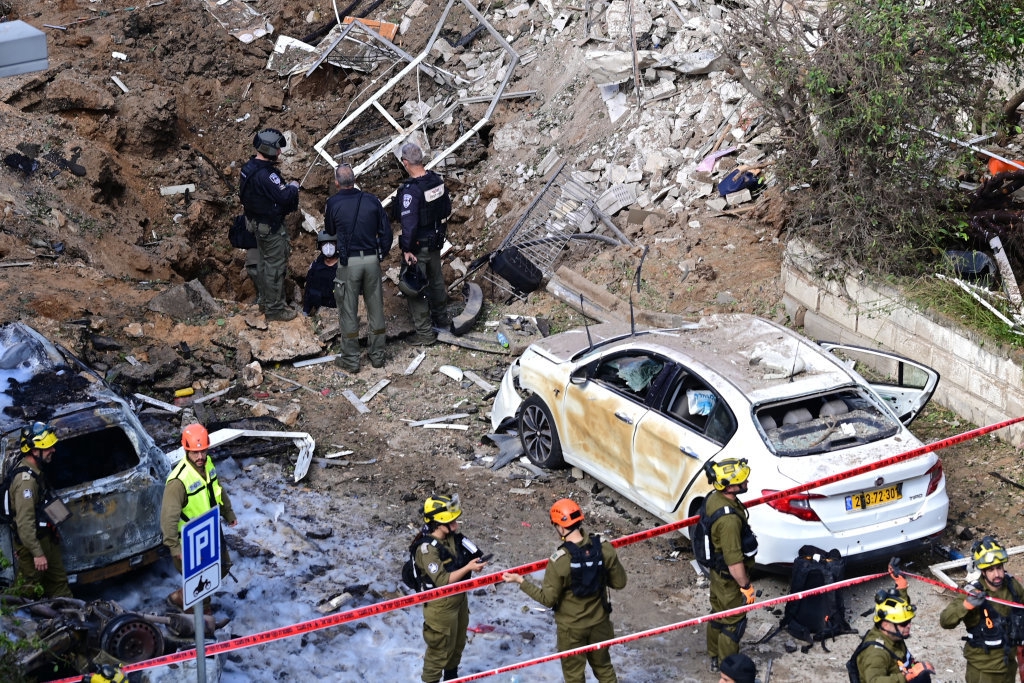 3月24日,在以色列中部城市特拉维夫,应急人员在导弹袭击现场处置。
