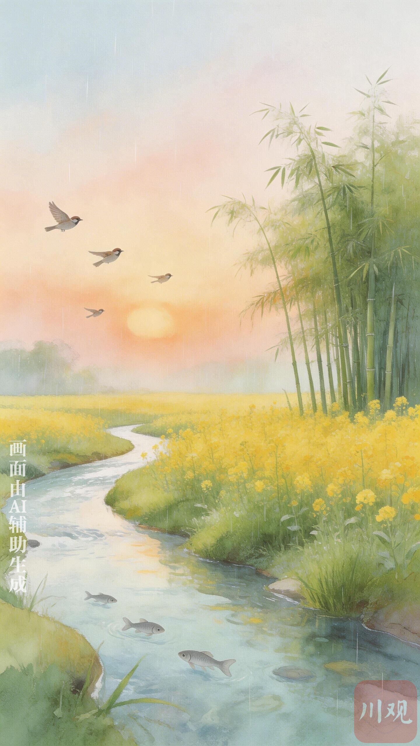 正午的太阳晒得人发暖,坐在老磨盘上歇脚,听见远处的桃树“噼啪”响,抬头看,是花瓣在落,一片接一片。午后竟飘起了细雨,不是夏天那种“噼里啪啦”的急脾气,是“沙沙沙”的,像妈妈在耳边讲故事。雨点落在油菜花上,“嗒嗒”地敲着花瓣;落在溪水里,“嘀嘀”地和鱼说话;落在我的草帽上,“噗噗”地打了个招呼就不见了。远处的屋檐下,有燕子在搭窝,“啾啾”地商量着,喙啄着泥巴的声音“笃笃”的,和雨声混在一起,竟像支温柔的曲子。