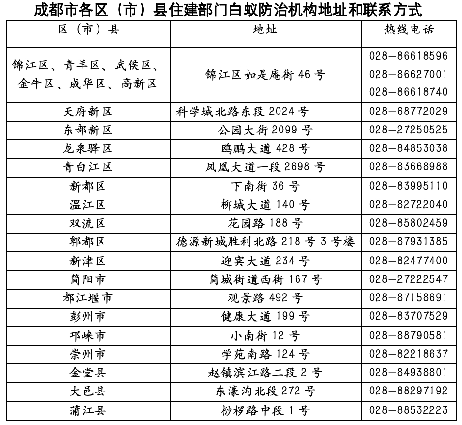 电话咨询受理:锦江区、青羊区、武侯区、金牛区、成华区、高新区的市民,可拨打成都市白蚁防治研究中心官方热线 028-86618596、86627001、86618740咨询登记;其他区(市)县的市民可拨打属地住建部门白蚁防治机构热线电话咨询。