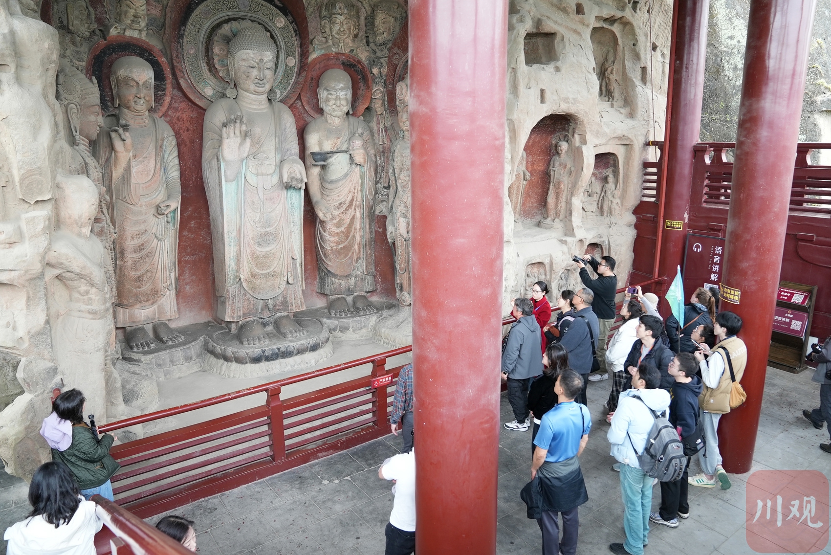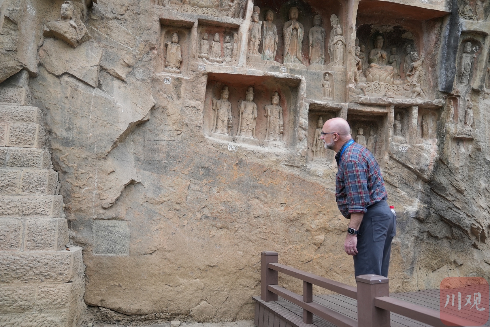 中美嘉宾在皇泽寺欣赏石刻艺术。