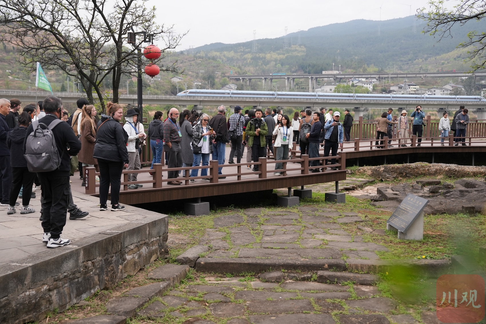 中美嘉宾在查看金牛道遗址,在他们身后,一列高铁飞驰而过。