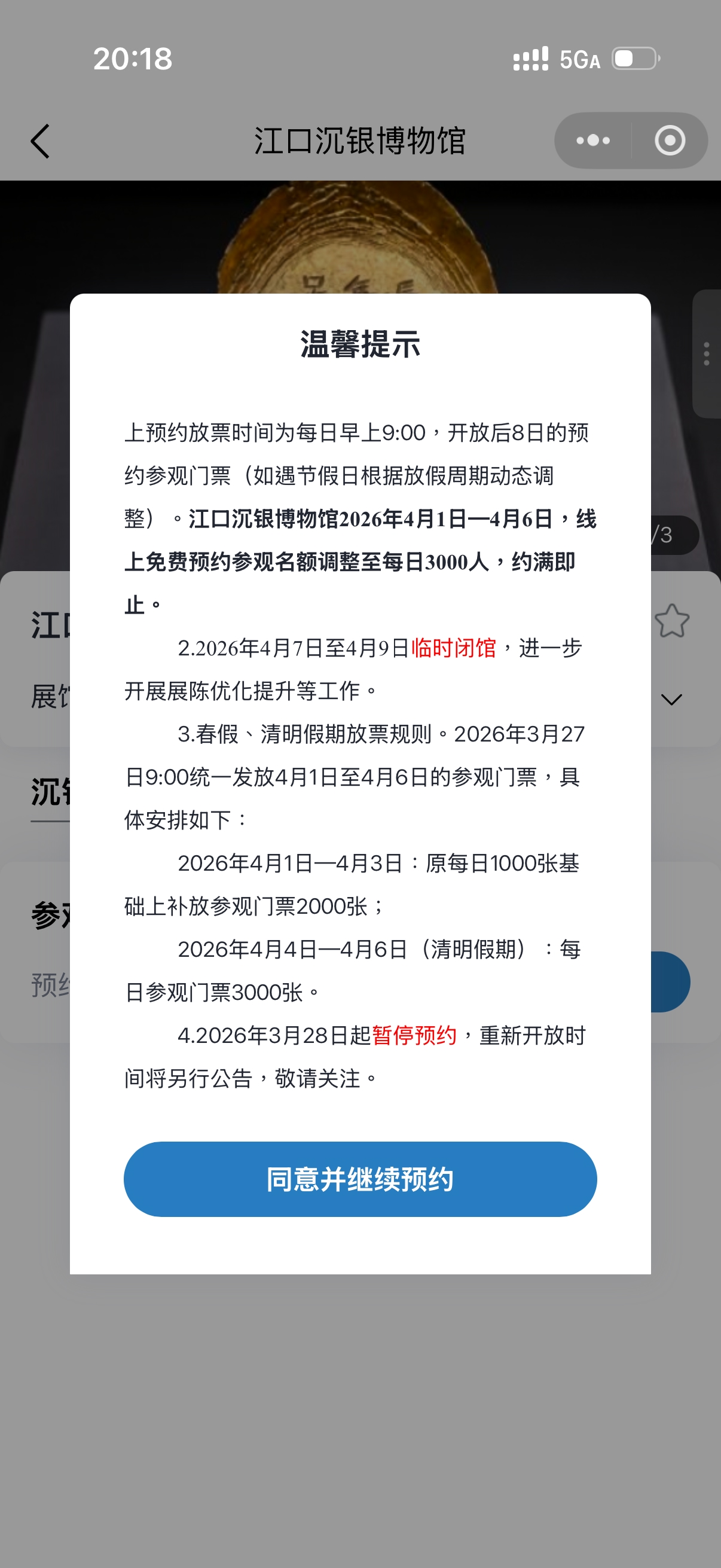 自3月6日启动线上限额免费预约、3月8日正式对公众开放参观以来,江口沉银博物馆热度持续攀升。前期每日1000人的免费限额,在公众高涨的参观热情面前显得“杯水车薪”,不少网友反映“定好闹钟也抢不到票”“页面一开放就显示约满”等。