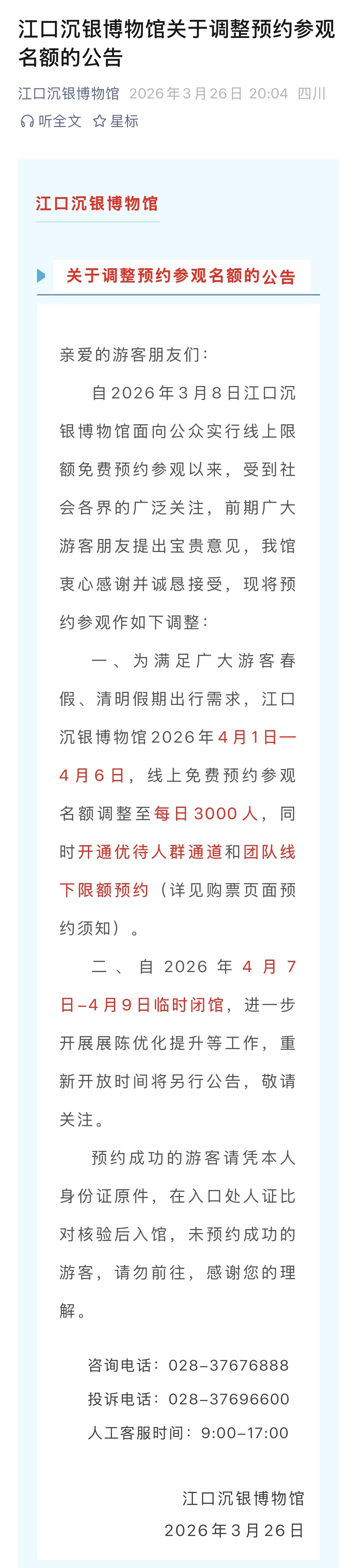 3月26日,四川在线记者从江口沉银博物馆方面获悉,为回应公众在春假和清明假期的参观需求,决定调高4月1日至6日的参观限额人数,由每日1000人的预约名额调高至3000人,约满为止。
