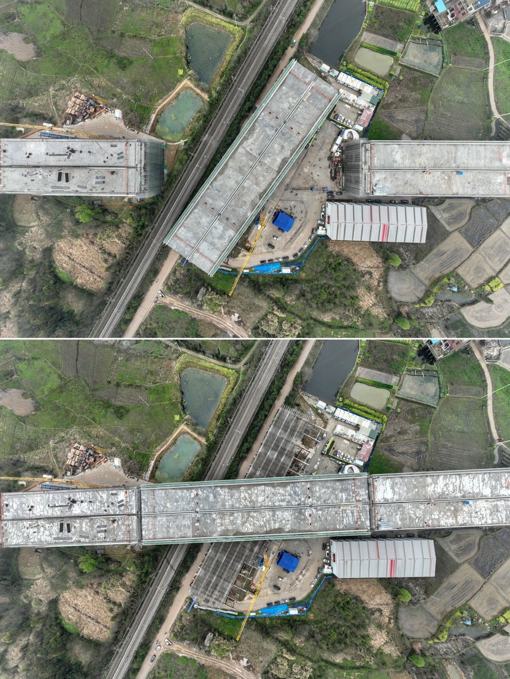 这是一张拼版照片:大桥在转体中(上)和转体后(下)的施工现场(3月26日摄,无人机照片)。