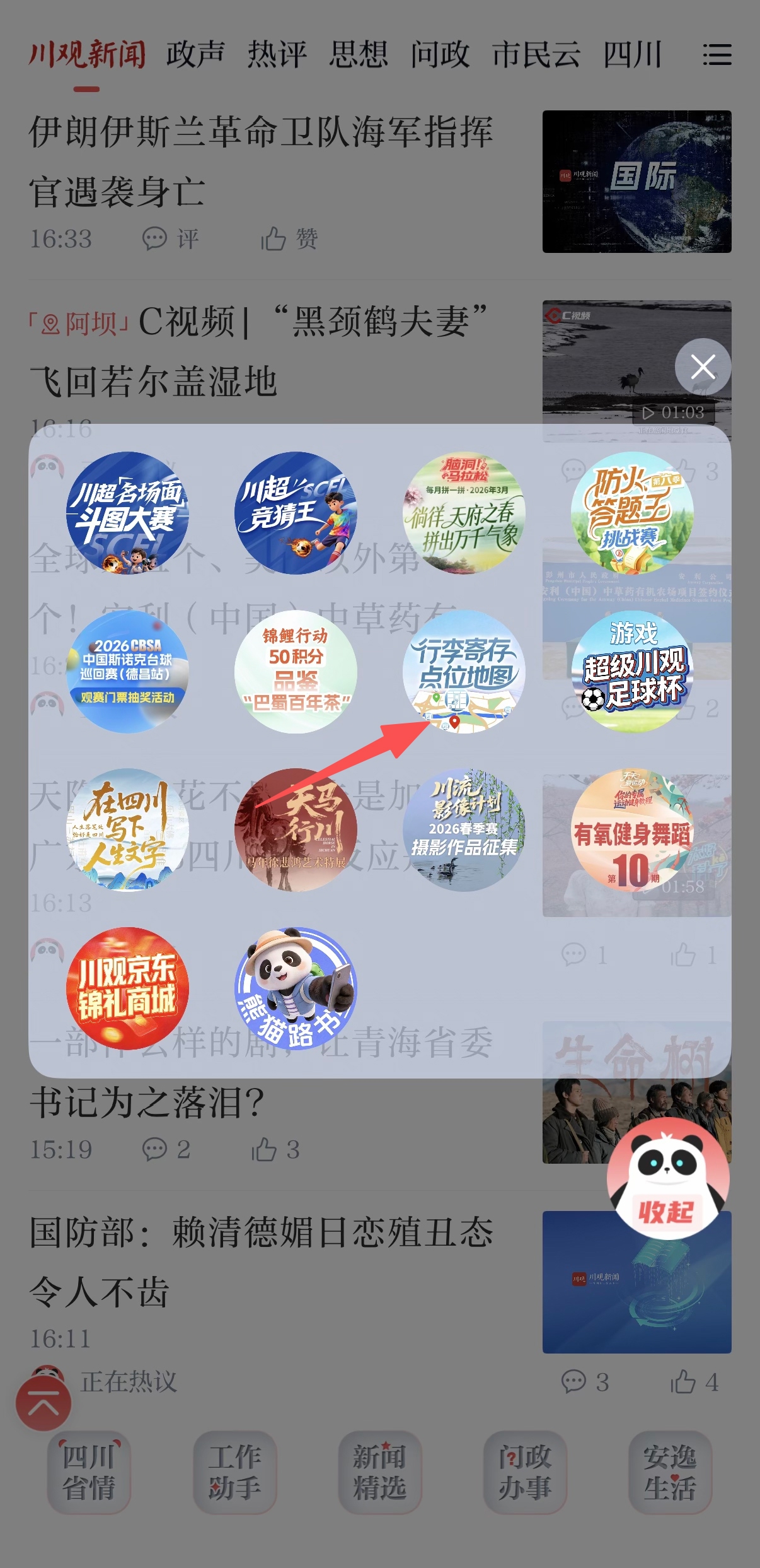 1.打开川观新闻,点击首页悬浮球,找到“行李寄存点位地图”图标,点击即可进行查询;