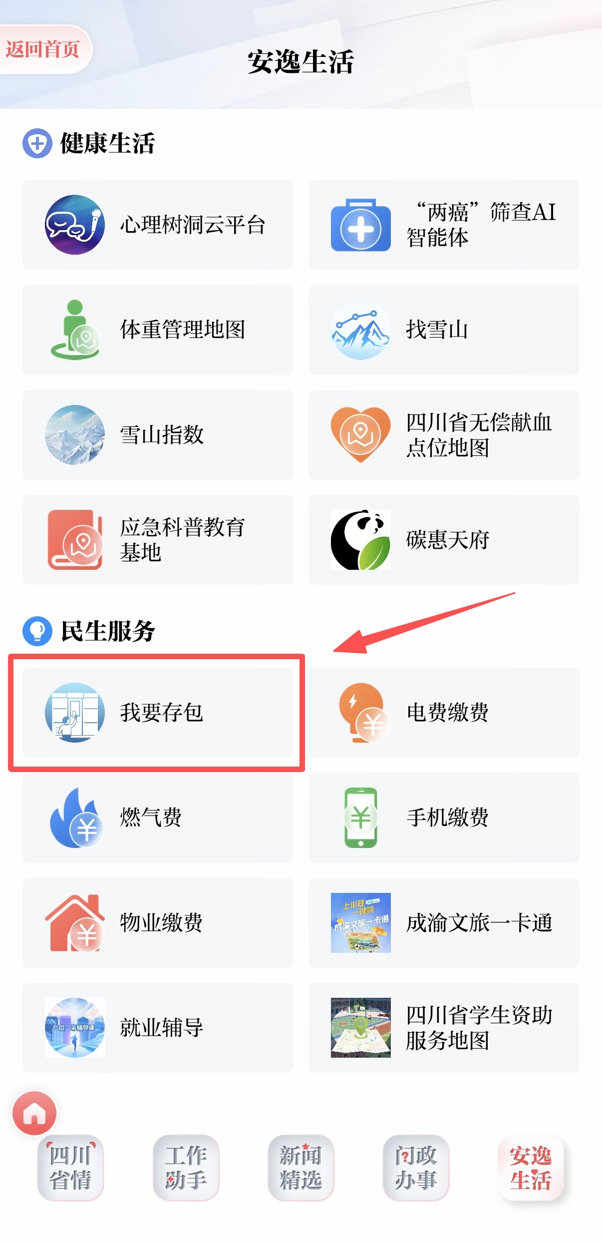 2.打开川观新闻,点击底部“安逸生活”栏目,找到“我要存包”图标,点击即可进行查询。